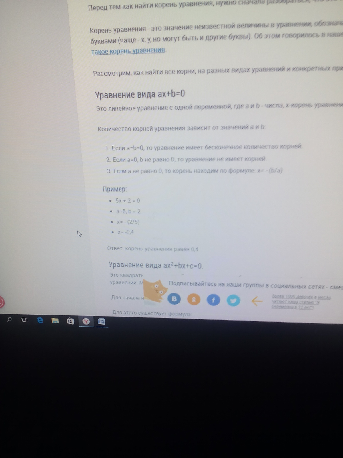 Одним из основных разделов математики является раздел, посвященный решению уравнений и нахождению корня уравнений. Перед тем как найти корень уравнения, нужно сначала разобраться, что это такое. Корень уравнения - это значение неизвестной величины в уравнении, обозначаемой латинскими буквами (чаще - x, y, но могут быть и другие буквы). Об этом говорилось в нашей статье - Что такое корень уравнения. Рассмотрим, как найти все корни, на разных видах уравнений и конкретных примерах. Уравнение вида ax+b=0 Это линейное уравнение с одной переменной, где a и b - числа, x-корень уравнения. Количество корней уравнения зависит от значений a и b: Если а=b=0, то уравнение имеет бесконечное количество корней. Если а=0, b не равно 0, то уравнение не имеет корней. Если а не равно 0, то корень находим по формуле: х= - (b/а) Пример: 5х + 2 = 0 а=5, b = 2 х= - (2/5) х= -0,4 Ответ: корень уравнения равен 0,4 Уравнение вида ax²+bx+c=0. Это квадратное уравнение. Есть несколько способов нахождения корней в квадратном уравнении. Мы рассмотрим общий, который подходит для решения при любых значениях а, b и с. Для начала нужно найти значение дискриминанта (D) этого уравнения. Для этого существует формула: D = b2-4ac В зависимости от того, какой поучился дискриминант, есть 3 варианта дальнейшего решения: Если D >0, то корней 2. И они вычисляются по формулам: x1= (-b + √ D) / 2а. х2= (-b - √ D) / 2a Если D =0, то корень один - его можно найти по формуле: х= - (b/2а) Если D<0, то уравнение не имеет корней. Пример: х2+3х-4=0 Здесь а=1, b=3, с= -4 D= 32 - (4*1*(-4)) D= 9- (-16) D=9+16 D=25 D>0, значит в уравнении будет 2 корня. √D=√25 = 5 Подставляем все значения в нашу формулу: х1 = (-3 +5)/2*1 х1=2/2 х1=1 х2= (-3-5)/ 2*1 х2= (-8)/2 х2= -4 Ответ: Корни уравнения равны 1 и -4.
