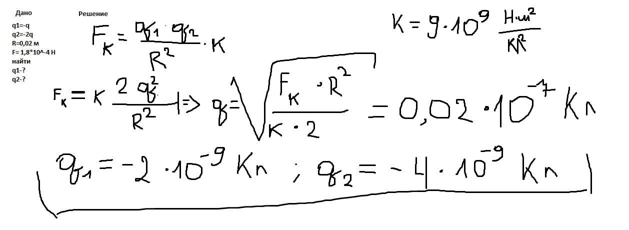 два отрицательных заряда -q и -2q находятся на расстоянии 20мм.Заряды взаимодействуют с силой 1,8*10^-4 Н.Каково значение каждого заряда?