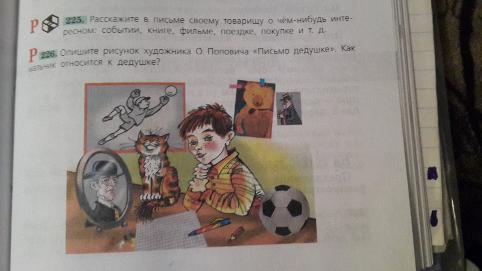 На рисунке мальчик смотря на фотографию дедушки вспоминает об нём. Он хочет написать ему, но, не может выразить всю любовь к дедушке.мальчик задумался .