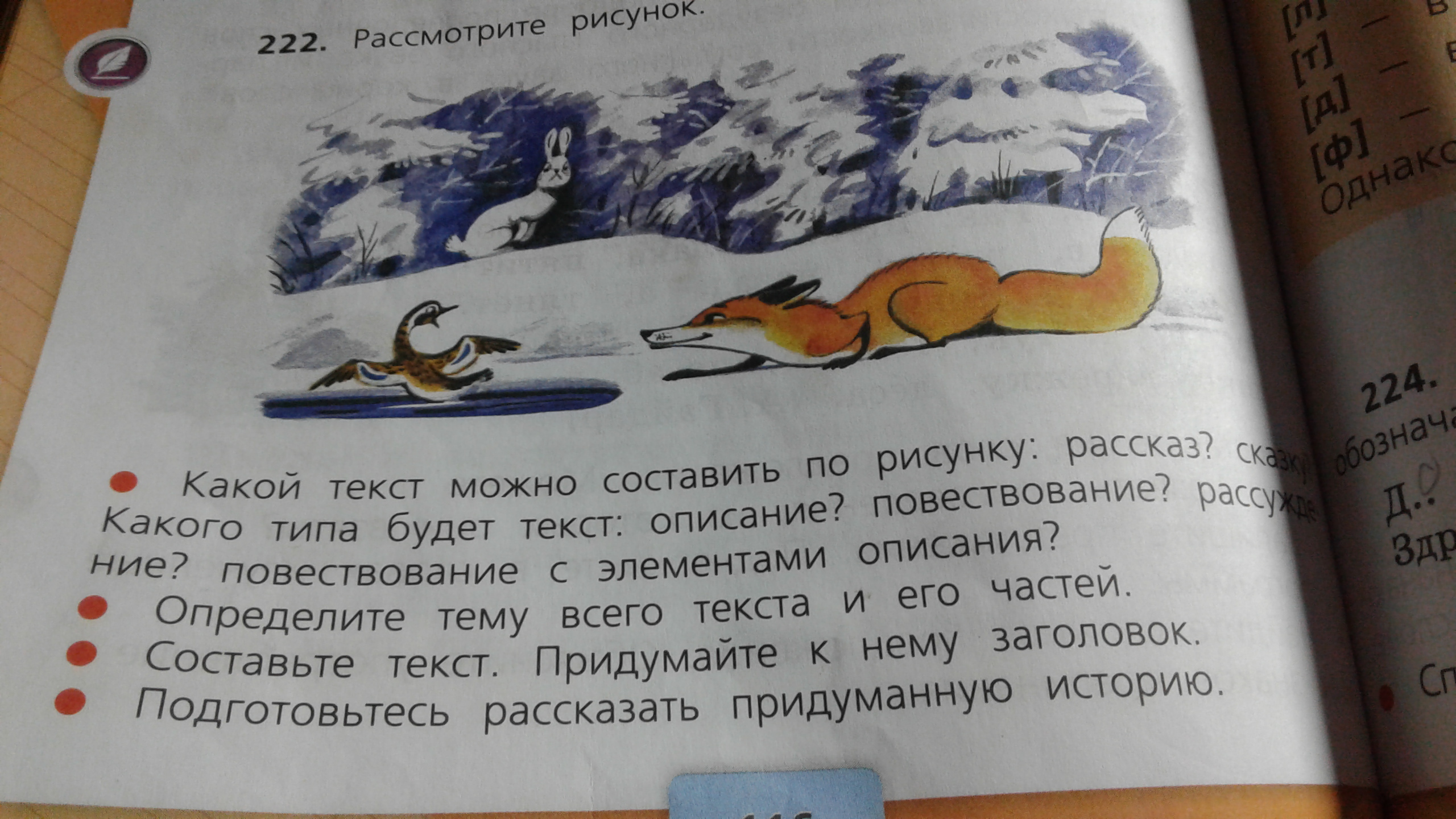 Наступила зима.Сугробы закрыли всю зеленую траву.Весь лес покрыт белоснежным снегом.На этом фоне снега видны лиса,утка и заяц.Лиса пытается словить утку,но та уплывает от неё.На это все удивленно смотрит заяц,растопырив свои уши.