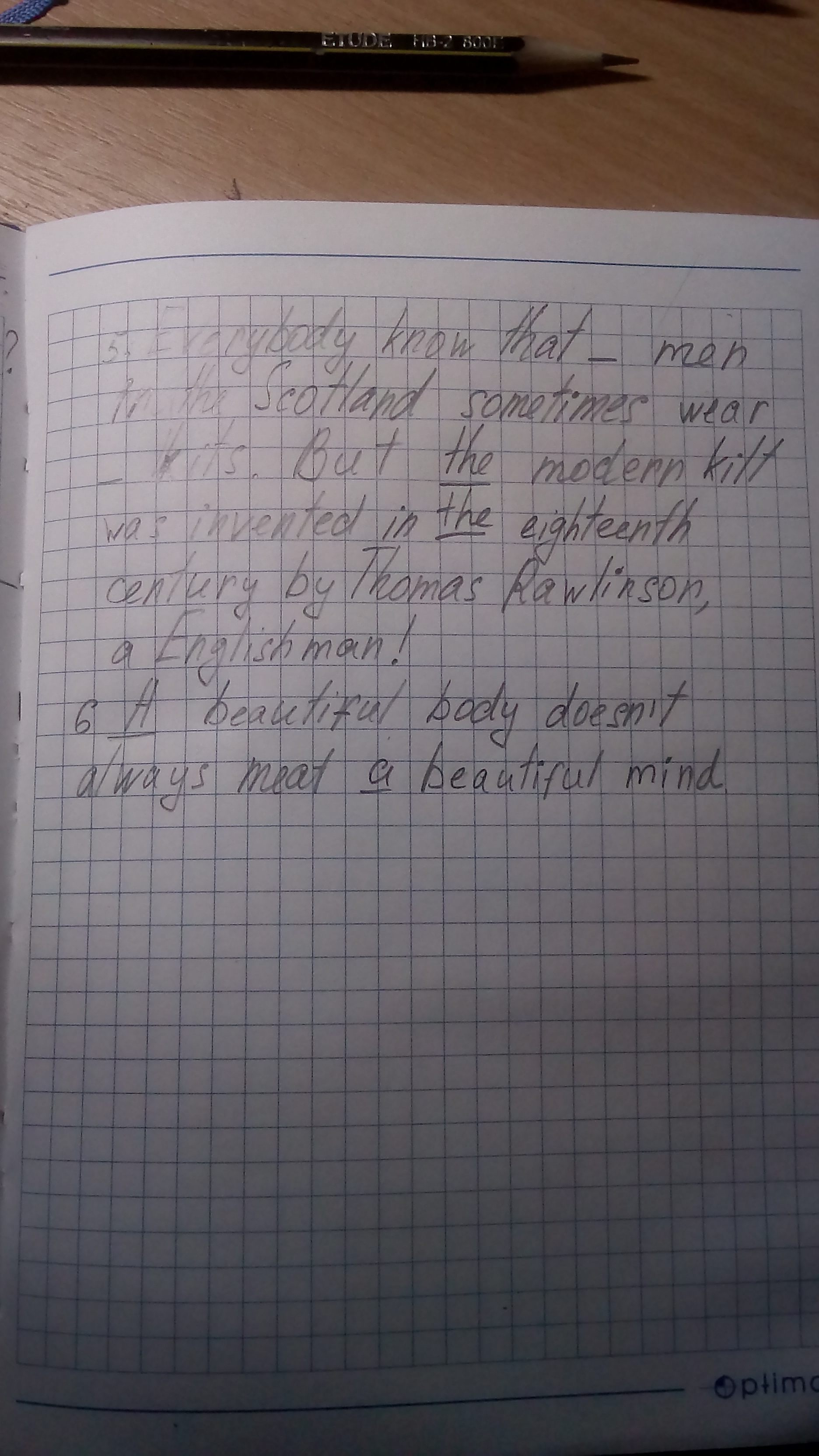 5. Everybody knows that __ men in __ Scotland sometimes wear __ kilts. But __ modern kilt was invented in __ eighteenth century by Thomas Rawlinson, __ Englishman!