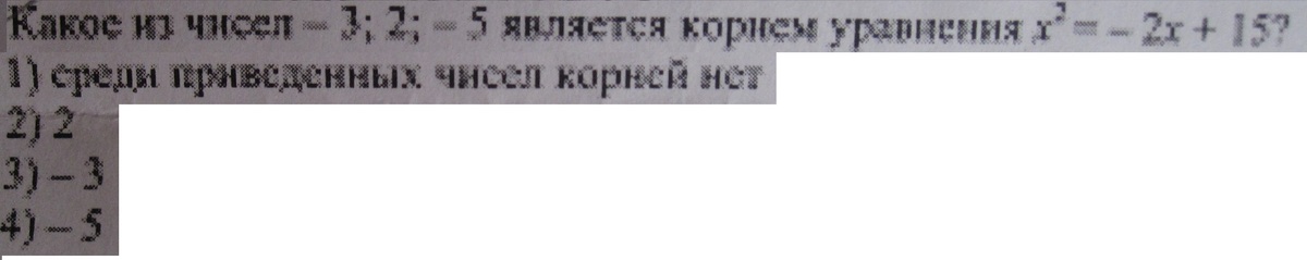 1. какое из чисел -3; 2 ; -5 является корнем уравнения Х2 = -2х + 15?