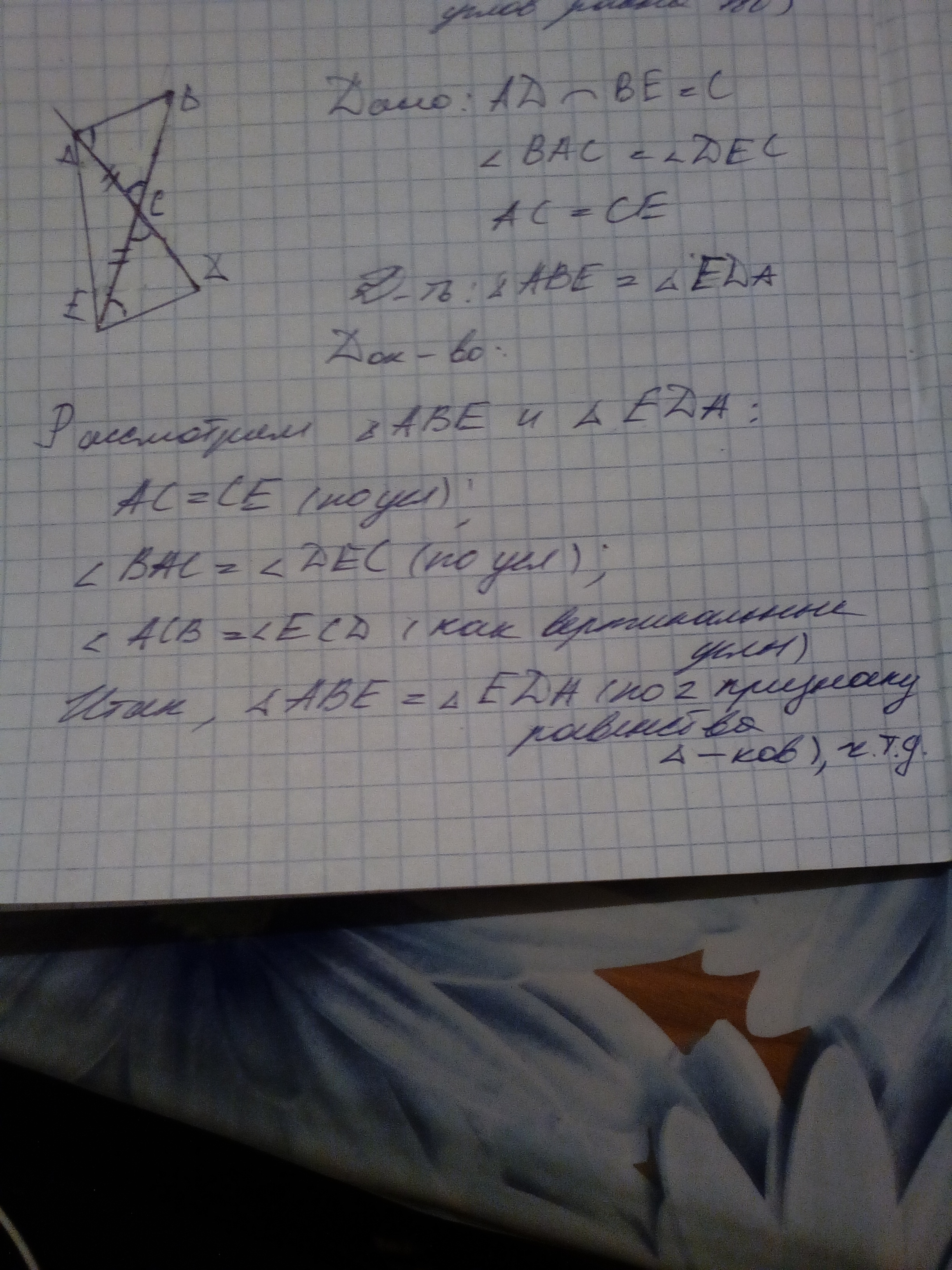 Отрезки AD и BE пересекаются в точке C, причем AC = CE и ∠BAC = ∠DEC. Докажите, что ᐃABE = ᐃEDA