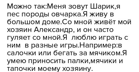 меня зовут шарик , я пёс породы овчарка. я живу в большом доме. со мной живёт мой хозяин Александр. он часто со мной играет в разные игры. например: в салочкм или бегать за мячом, а также кидание палки на расстояние- апорт. мне очень нравиться жить в моей семье. они самые добрые и отзывчивые хозяева!