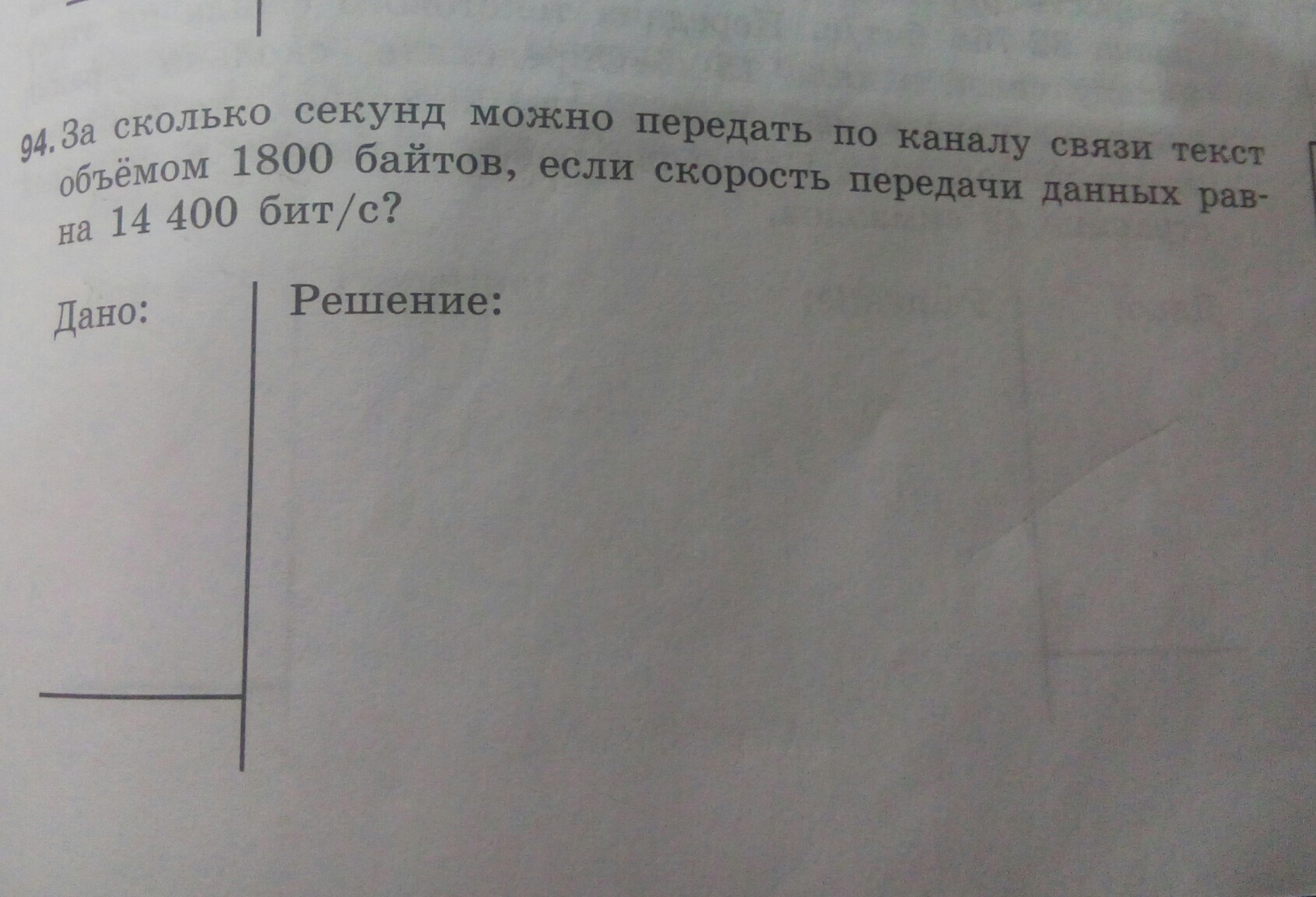 Еще 2 задачи! 1. Сколько CD объемом 700 Мбайт потребуется для размещения информации, полностью занимающей жесткий диск емкостью 120 Гбайт? Дано и решение. 2. Средняя скорость передачи данных по некоторому каналу связи равно 30720 бит/с Определите, сколько понадобится секунд, чтобы передать по этому каналу 80 страниц текста, каждая страница которого содержит в среднем 128 символов, а информационный вес одного символа равен 8 бит. Тоже дано и решение.