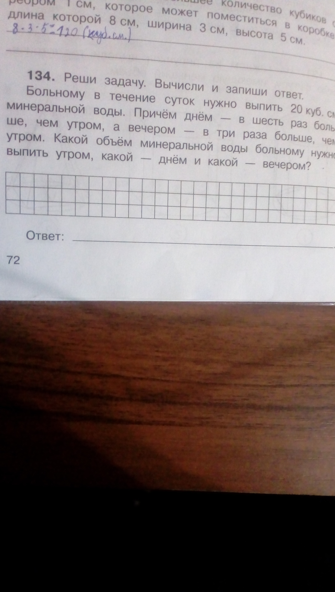 Больному в течение суток нужно выпить 20 куб.см минеральной воды. Причём днём- в шесть раз больше, чем утром, а вечером- в три раза больше, чем утром. Какой объём минеральной воды больному нужно выпить утром, каеой-днём и какой-вечером? ПОЖАЛУЙСТА ПОМОГИТЕ!!! (вот если что фото)