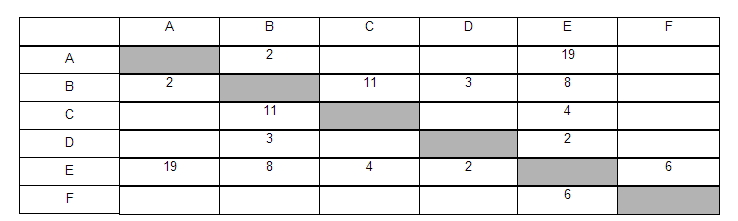 Между населёнными пунктами A, B, C, D, E, F построены дороги, протяжённость которых приведена в таблице. (Отсутствие числа в таблице означает, что прямой дороги между пунктами нет.)