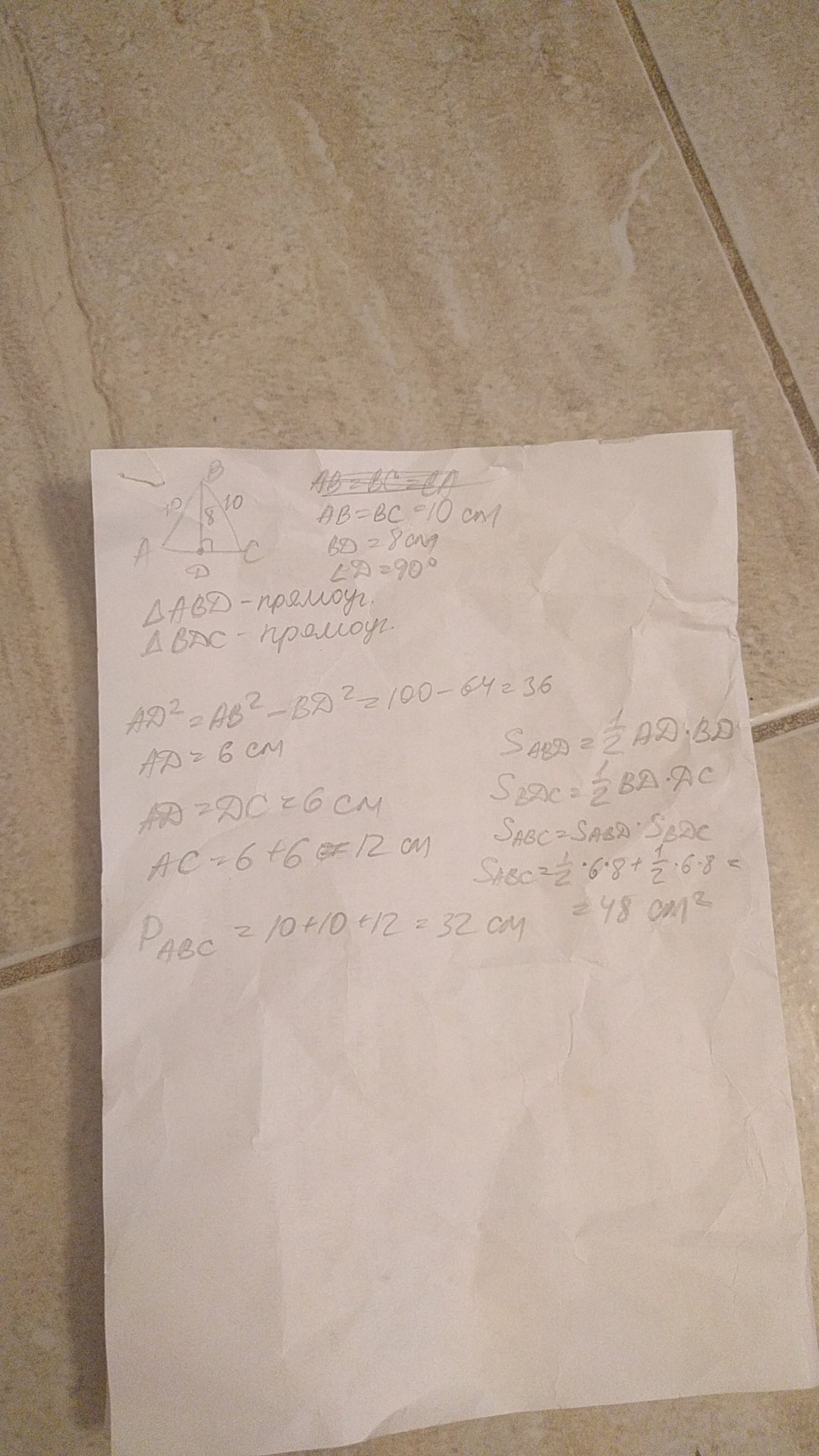 В равнобедренном треугольнике высота проведенная к основанию равна 8 см,боковая сторона равна 10 см.Найти периметр и площадь треугольника.(по теореме пифагора)
