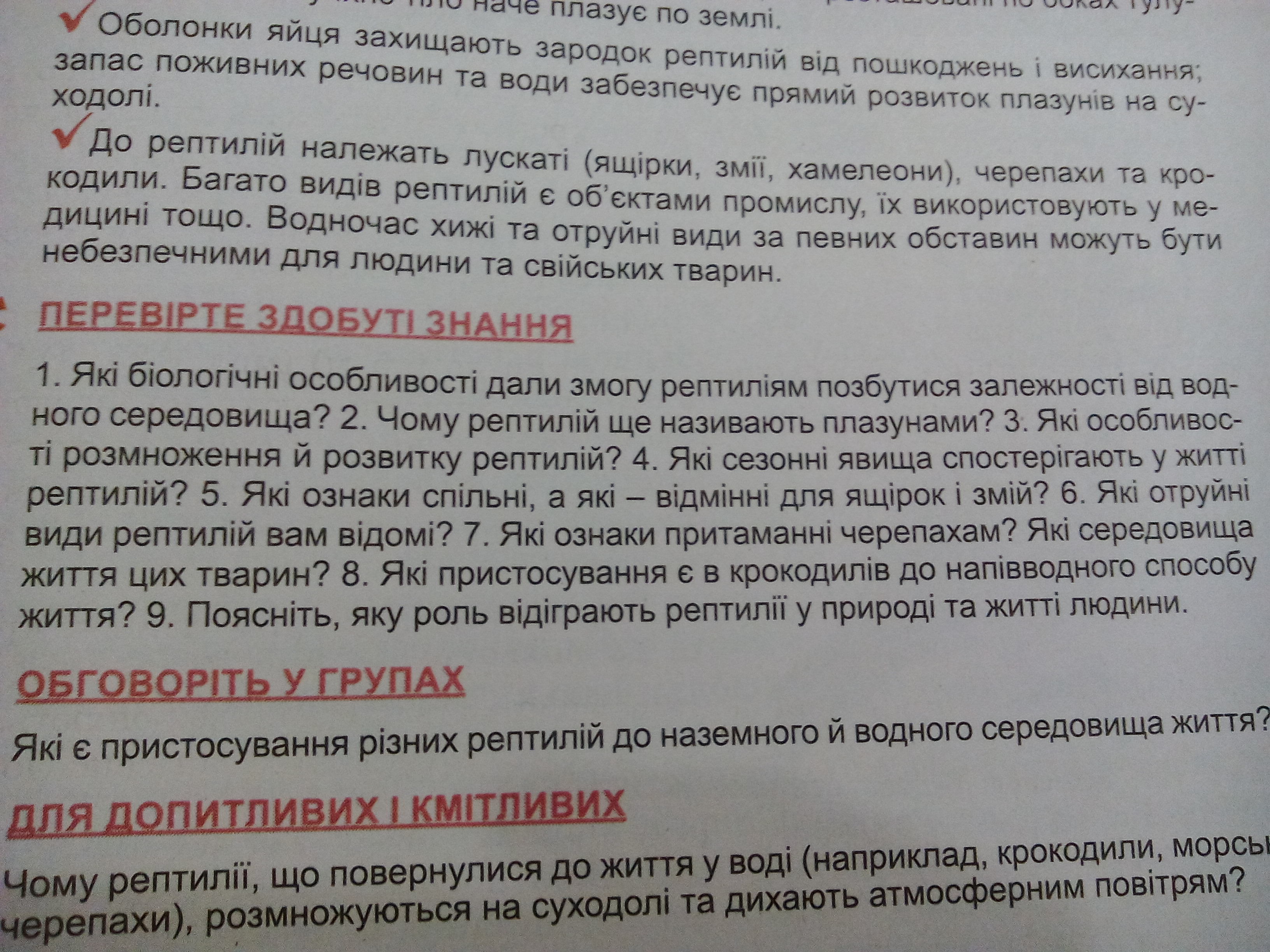 1.позбутися выд водного середовища дали змогу: товсті рогові луски,які оберігають тіло від надмірного середовища.2)пересуваючись вони якби "плазують"(наподобі змій і т.д.)3)у рептилій запліднення внутрішнє і спостерігається відкладання яєць з яких потім виходять схожі на батьківську особу дитинчата(без метаморфоз)4)Сезонна активність є пристосуванням до існування у різних зонах. У тропіках і субтропіках слабо виражена, а у помірних широтах активні коли тепло, тоді як взимку рептилії впадають в сплячку.Активність плазунів залежить від середовища5)спільні:холоднокровність,рогові луски,відмінні:у ящірок на відміну від змій є кінцівки та миготлива перетинка 7)наявність екзоскелету.Середовище прожив:вологе