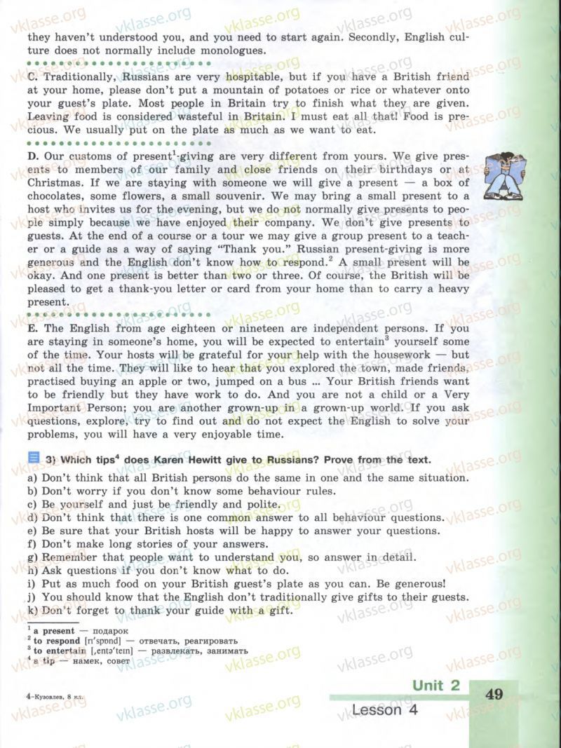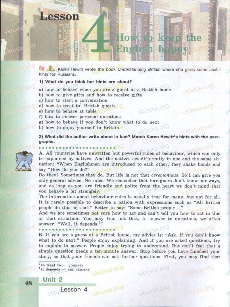 A. Все страны имеют неписаные, но мощные правила поведения, которых с объяснимая туземцев. И местные жители действуют по-разному в одном и са туации: "Когда англичане знакомятся друг с другом, они трясут хар сказать:" Как ты это делаешь "ли они Иногда они делают, но жизнь не так церемонно, поэтому я могу г?.. только общие рекомендации. Никаких правил. мы не помнить, что иностранцы не знают, НУ и до тех пор, как вы дружелюбны и вежливы от сердца мы не пц вы ведете себя немного странно информация о правилах поведения, как правило, справедливо для многих, но не Крайне редко можно описать нацию с такими выражениями, как "Все люди делают это или то." Лучше сказать: "Некоторые британские люди и мы иногда не уверены, как действовать и не могу сказать вам, как действовать или ситуация. Вы можете обнаружить, что, в ответ на вопросы, мы отвечаем, Ну, это зависит от B. Если вы гость в британском доме, мой совет: "Спросите, если вы не" что делать дальше. " Люди любят объяснять. И если вас просят Questio объяснить в ответ. Люди любят, пытаясь понять. Но не чувствую простой вопрос нуждается в десятиминутный ответ. Стоп, прежде чем вы finishe историю, так что ваши друзья могут задать дополнительные вопросы.
