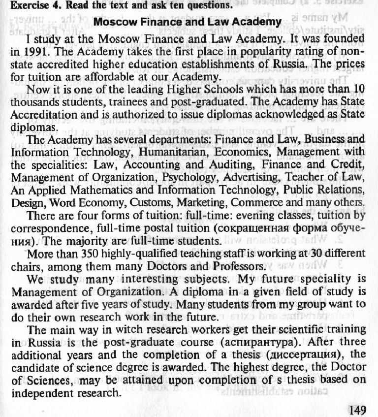 Я учусь в Московской финансово-юридической академии. Он был основан в 1991 году Академия занимает первое место в рейтинге популярности негосударственной accreditcd highcr cducation cstablishmcnts России. Цены на обучение по доступной цене в нашей Академии. Сейчас он является одним из ведущих высших учебных заведений, которая имеет более 10 тысяч студентов, стажеров и последипломное. Академия имеет государственную аккредитацию и имеет право выдавать дипломы признаются дипломы государственного образца Академия имеет несколько отделов: финансов и права, бизнеса и информационных технологий, гуманитарное, экономика, менеджмент с специальностей: юриспруденция, бухгалтерский учет и аудит, финансы и Crcdit управления Организация, психология, реклама, учитель закона An Applicd математики и информационных технологий, связей с общественностью, дизайн, Word экономики, таможни, маркетинга торговли и многие другие Есть четыре формы обучения: полный рабочий день: вечерние занятия, обучение по переписке, полный -time обучение coKpaLLeHHan почтовый 4opMa ooye HMH). Большинство из них студентов-очников. Более 350 высококвалифицированных профессорско-преподавательский состав работает на 30 различных кафедр, среди них много докторов и профессоров. Мы изучаем много интересных предметов. Моя будущая специальность Менеджмент организации. Диплом в данной области исследования присуждается после пяти лет обучения. Многие студенты из моей группы хотят сделать свою собственную научно-исследовательскую работу в будущем. Главным образом в научных работников ведьмами получить их scientifie обучение в России является аспирантура (acTwpaHTypa). После трех дополнительных лет и завершение диссертации (AnccepTaunA), кандидат наук степень присуждается. Самая высокая степень, доктор наук, может быть достигнута по завершении диссертацию на основе независимых исследований.