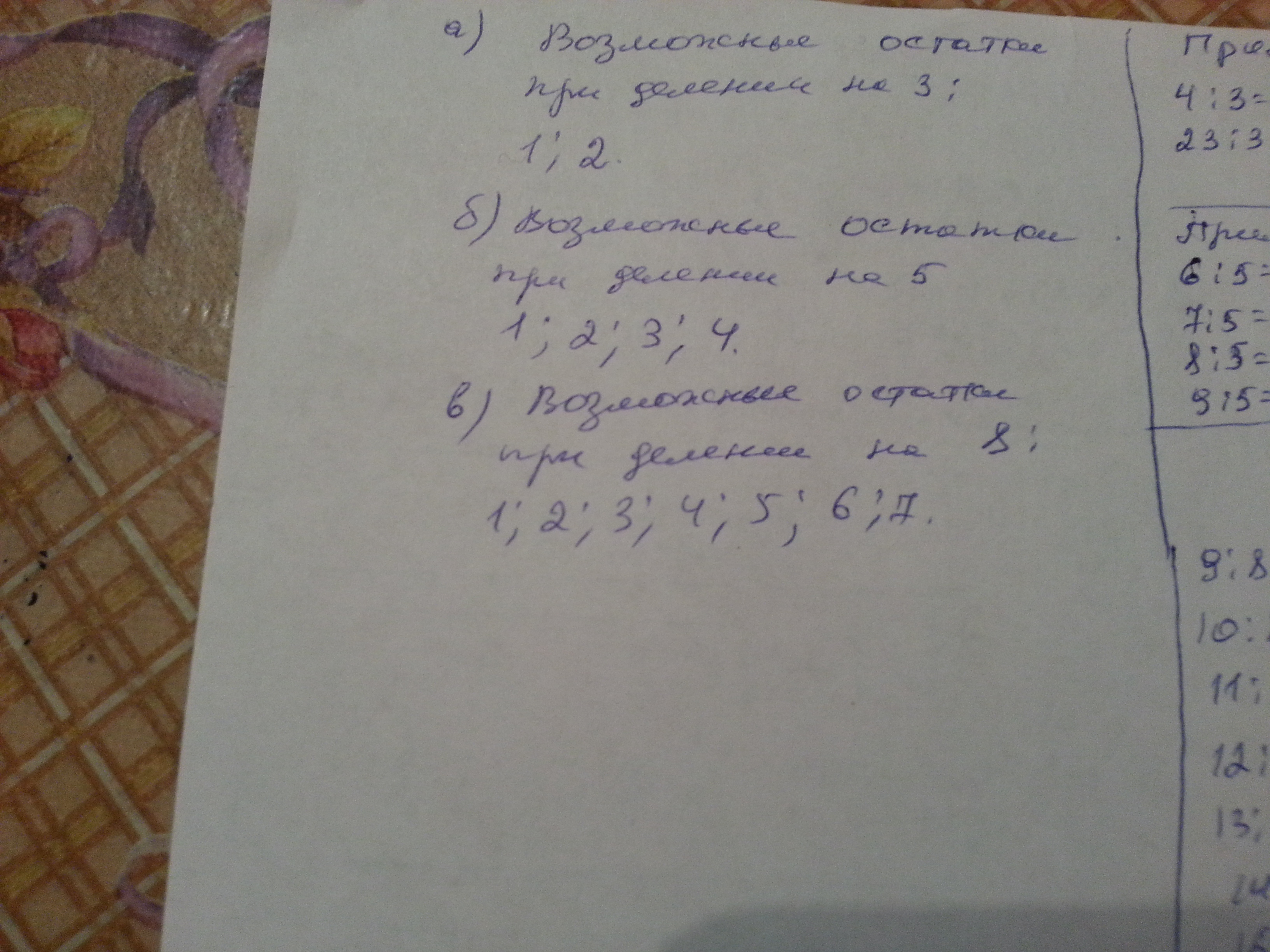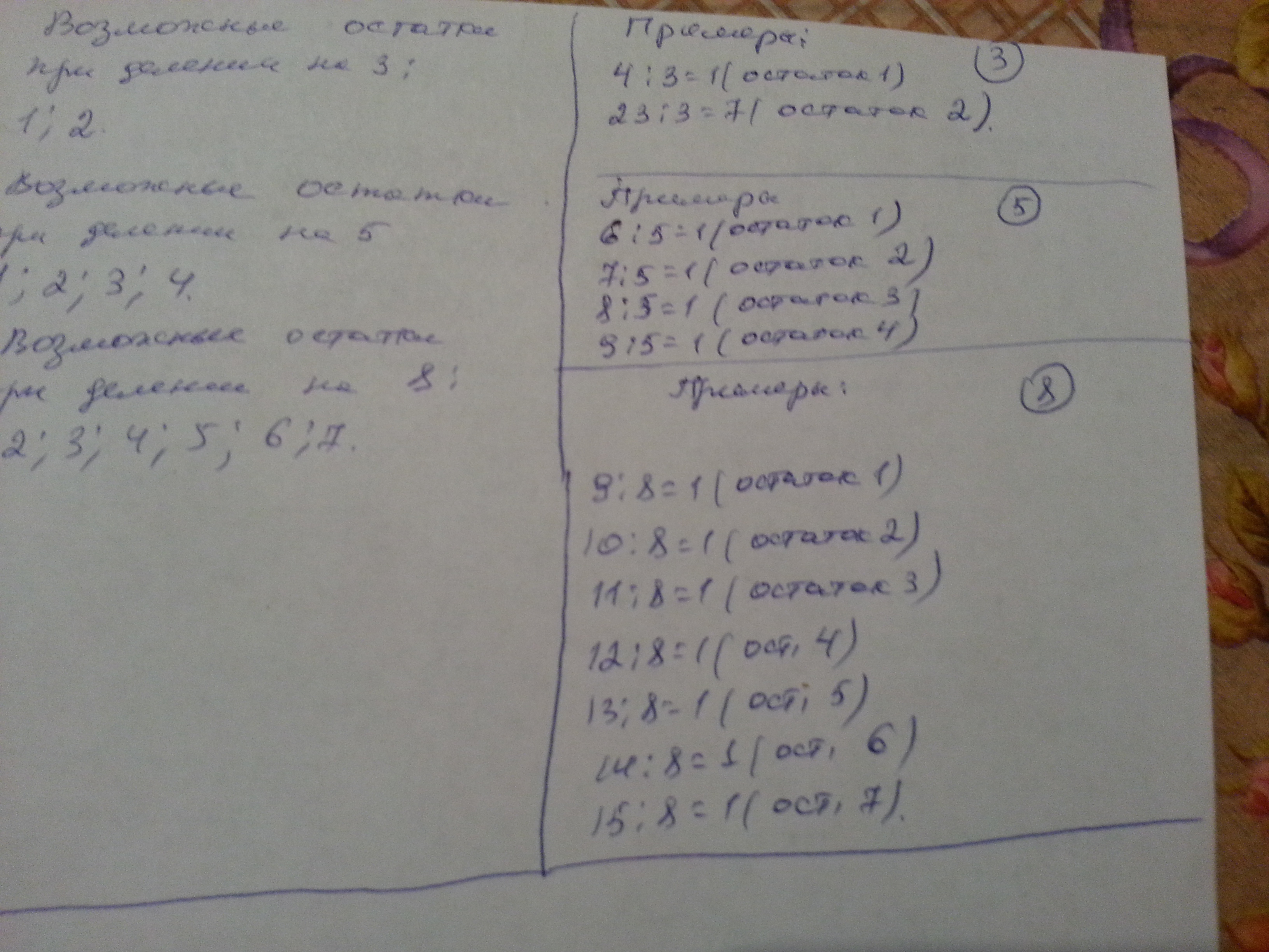 Какие возможные остатки при делении на: а) 3; б) 5; в) 8? Приведите соответствующие примеры.