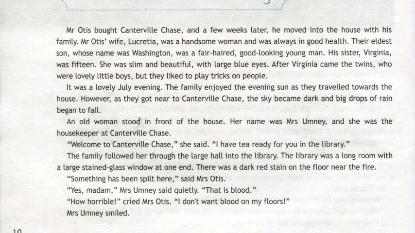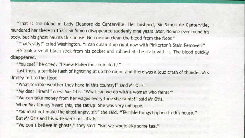 Кровь леди Элеонор де Кентервиль. Ее муж, сэр Саймон де Кентервиль убил ее в 1575 году. Сэр Саймон исчез девять лет спустя. Никто не мог найти его тело, но его дух (привидение) поселилось в доме. И никто не мог вычистить (стереть) кровь с пола.