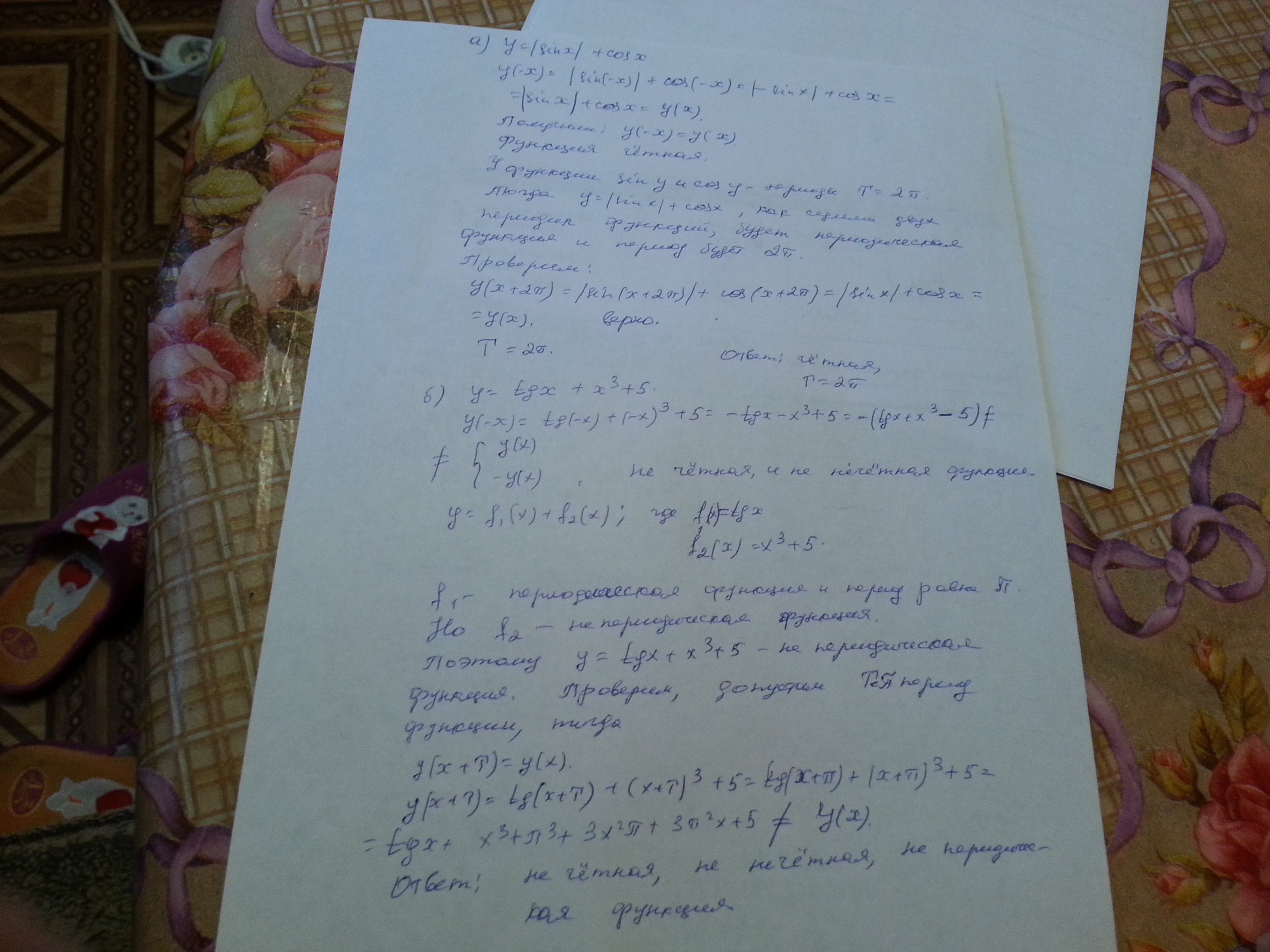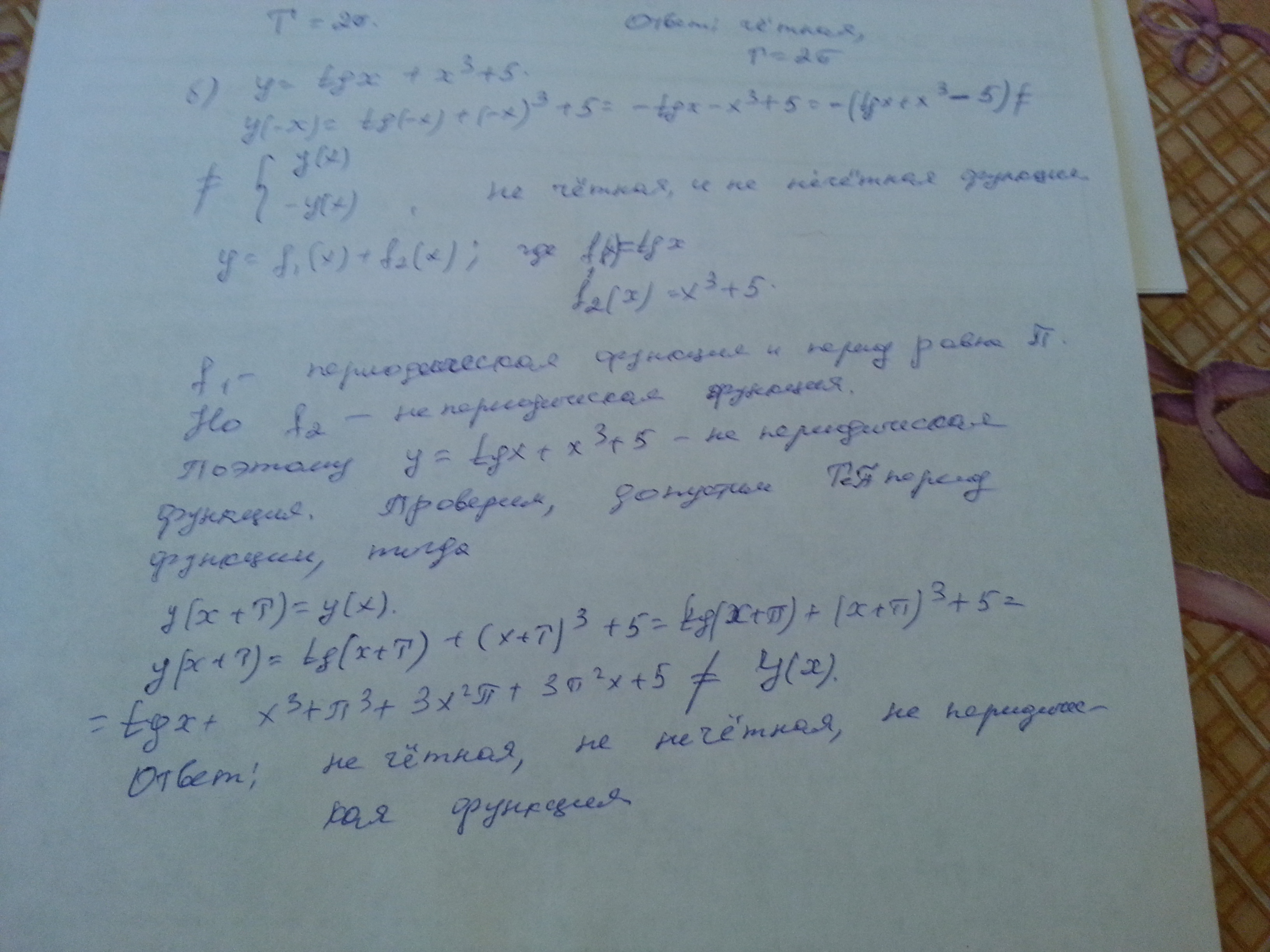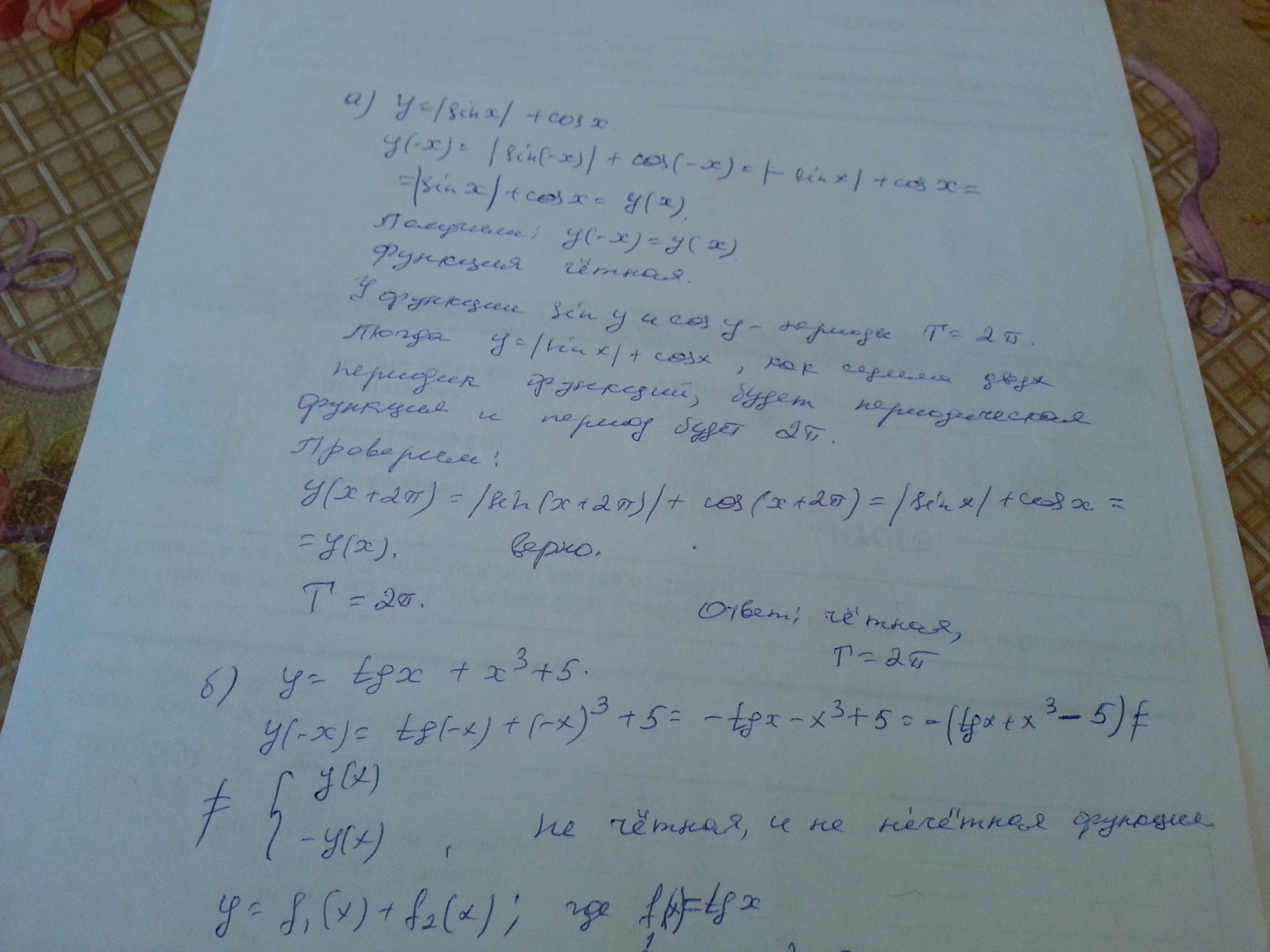 номер 6. Исследуйте функцию на четности, укажите основной период, если он существует:а) y=|sinx|+cosxб) y=tgx+x^3+5