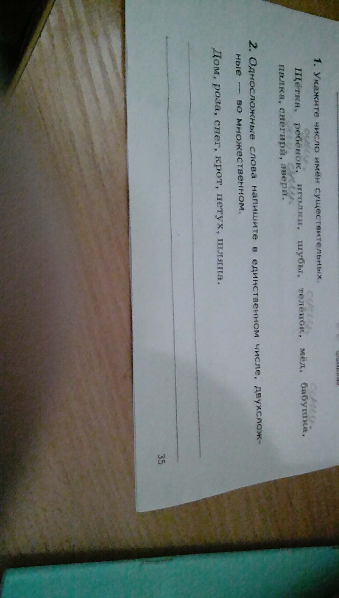 1. щетка - ед.ч; ребенок - ед.ч, иголки - мн.ч, шубы - мн.ч, теленок - ед.ч, мед - ед.ч, бабушка - ед.ч, палка - ед.ч, снегири - мн.ч, звери - мн. ч.