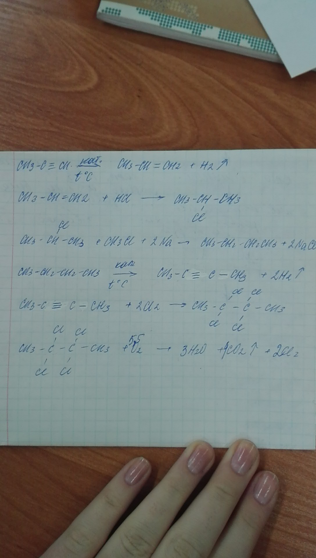 запишите уравнения химических реакций необходимых для осуществления превращения: Пропин=> пропен=> хлорпропан=> бутан=> бутин=> тетрахлорбутан=> углекислый газ