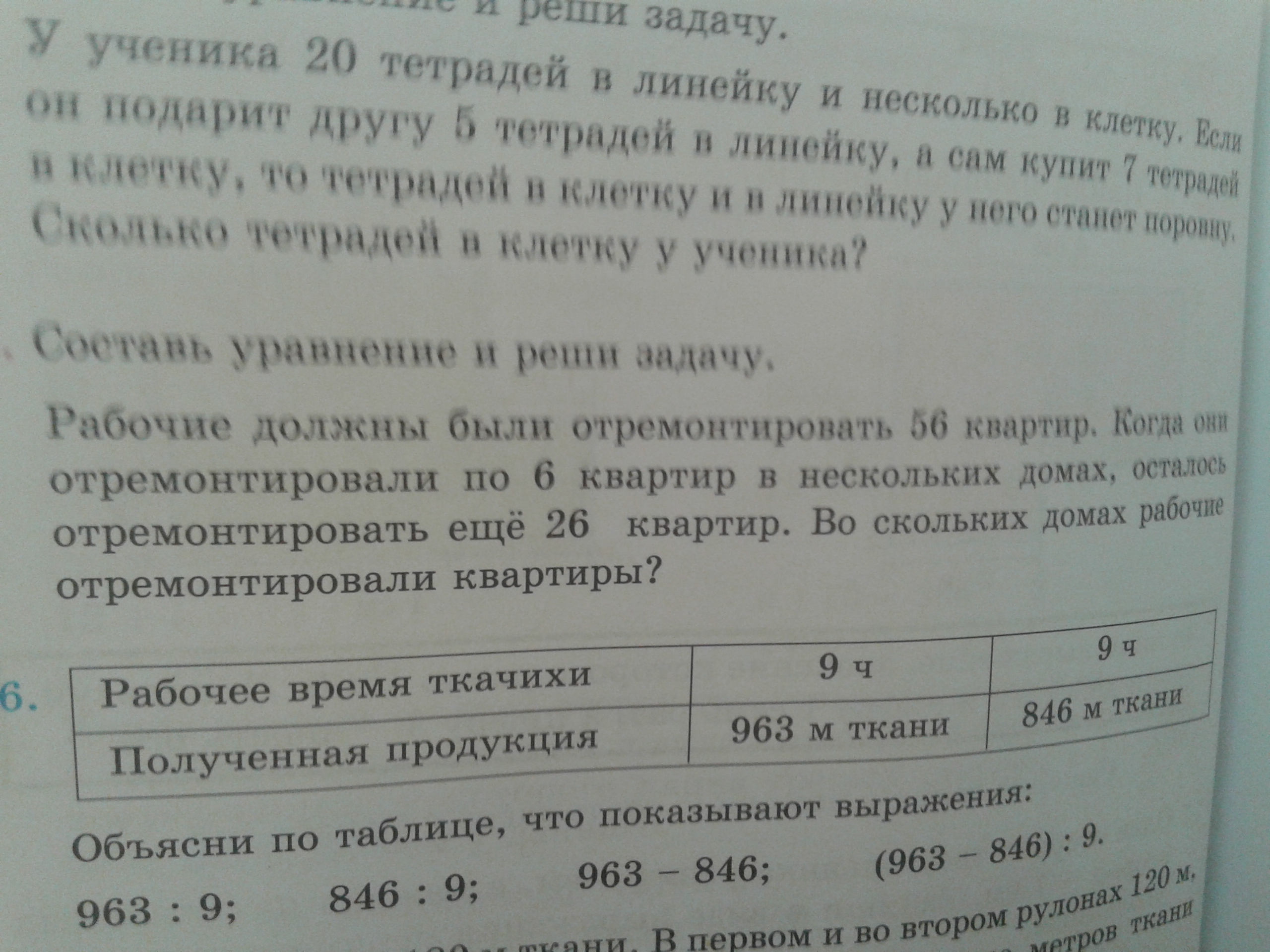 )56-26=30. 2)30:6=5. ОТВЕТ: Значит в 5 домах рабочие отремонтировали квартиры... Получается всего должны были 56 отремонтировать. Отремонтировали 30. Осталось 26. Теперь в виде уравнения: (x•6)+26=56 x•6=56-26 x•6=30 x=30:6 x=5. ОТВЕТ: 5.