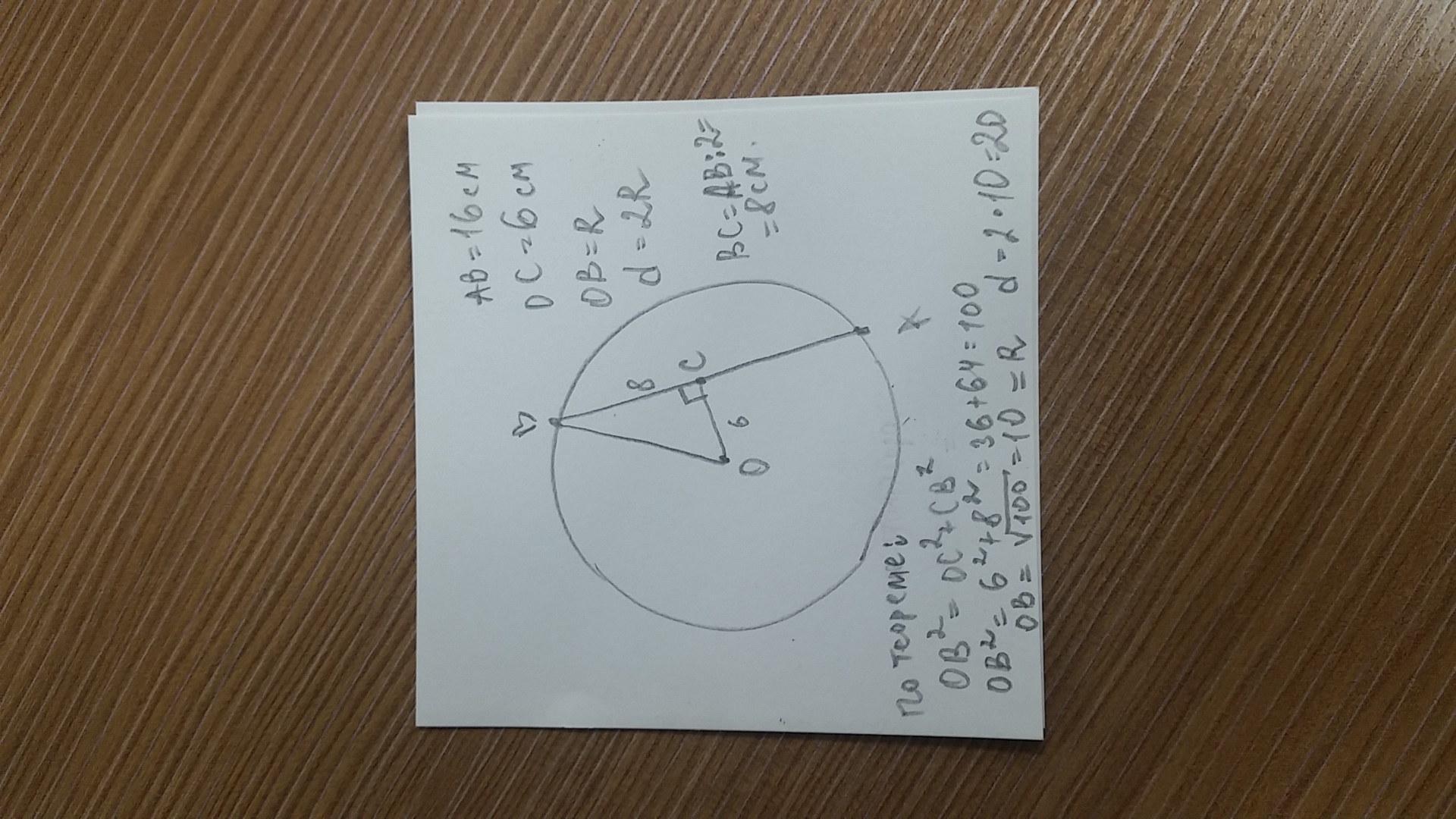постройте окружность.Проведите хорду.Длина хорды 16см.Центр хорды удалён от центра окружности на 6 см.вычислите радиус и диаметр окружности