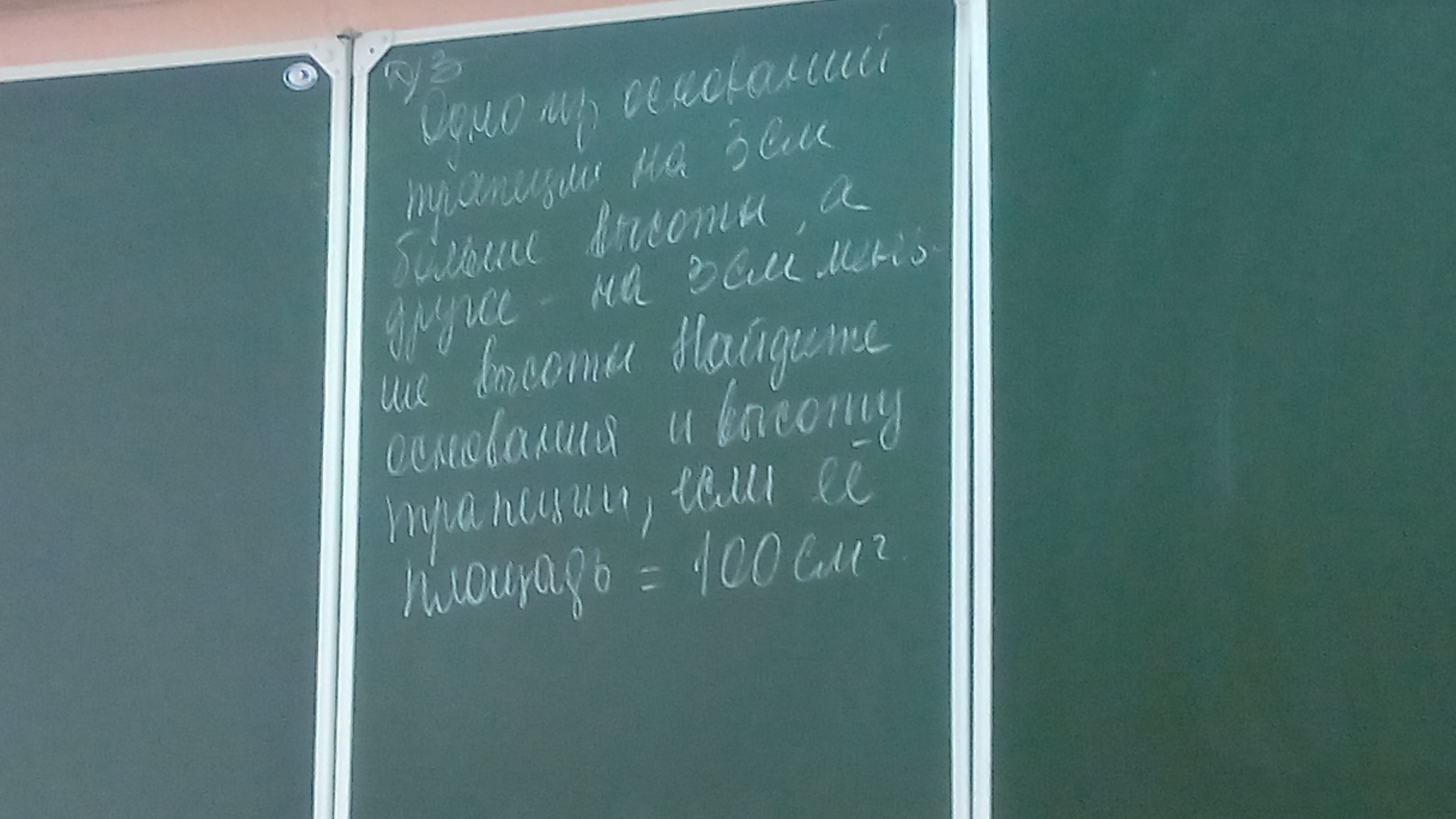 1.Пустье x высто тогда одно основание равно x+3 а второе основание рано x -3 .Т. к. S равна 100 см квадратных .