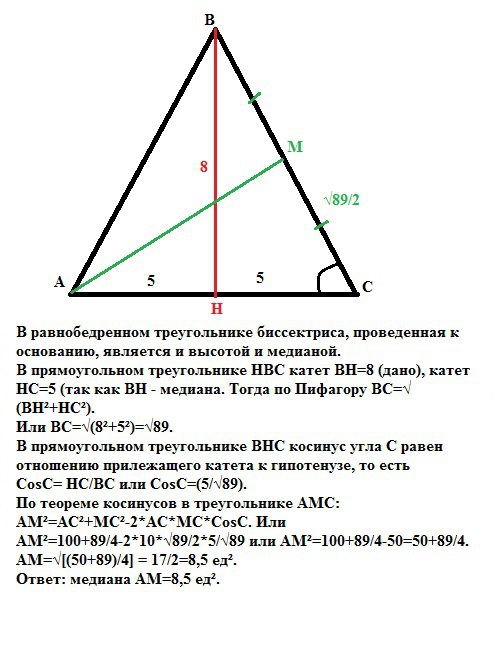 В прямоугольном треугольнике НВС катет ВН=8 (дано), катет НС=5 (так как ВН - медиана. Тогда по Пифагору BC=√(BH²+HC²).