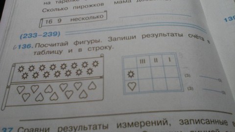 Помогите сделать задание № 136 Эльконина Давыдова 2 класс.посчитай фигуры результаты счета запиши в таблицу и в строку.