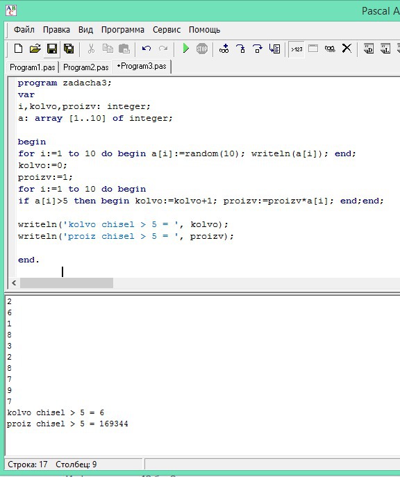 beginfor i:=1 to 10 do begin a[i]:=random(10); writeln(a[i]); end;kolvo:=0;proizv:=1;for i:=1 to 10 do beginif a[i]>5 then begin kolvo:=kolvo+1; proizv:=proizv*a[i]; end;end;