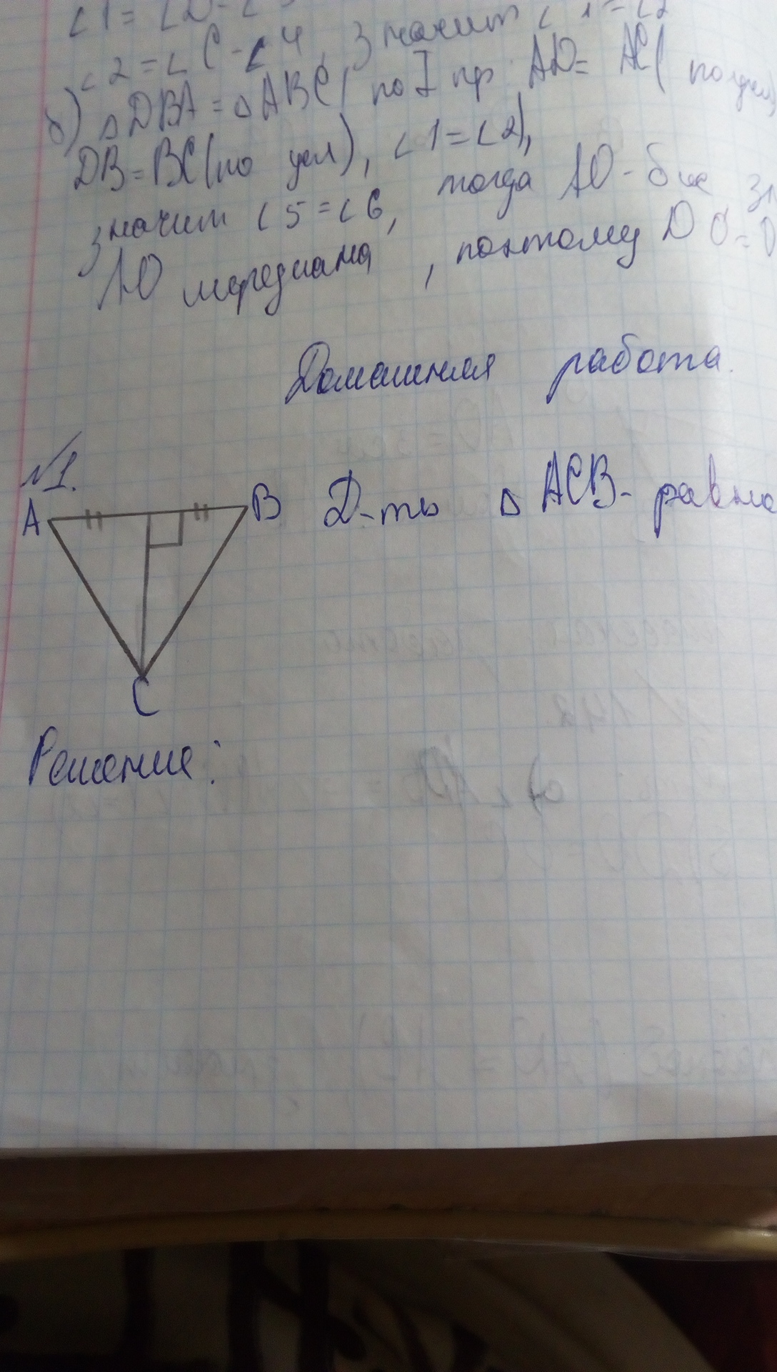 ADC = CDB по 1 признаку (прямой угол, общая сторона, AD=DB) или если проходили прямоугольные треугольники - по двум катетам.
