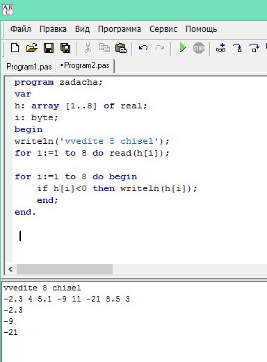 Составьте программу ввода элементов массива h [1..8] с клавиатуры и вывода на экран элементов с отрицательным значением