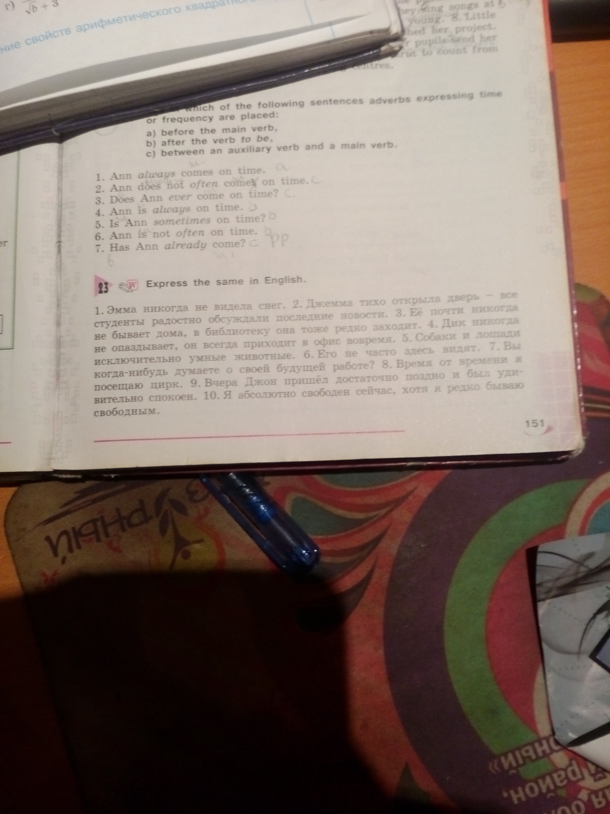 1. Emma had never seen snow. 2. Gemma quietly opened the door - all the students are happily discussing the latest news. 3. It almost never home, in a library, it also rarely comes. 4. Dick is never late, he always comes to the office on time. 5. Dogs and horses are extremely smart animals. 6. Its not often see here. 7. You ever think about your future work? 8. From time to time I visit the circus. 9. Yesterday John came late enough and were surprisingly quiet. 10. I'm completely free now, although I'm rarely free.