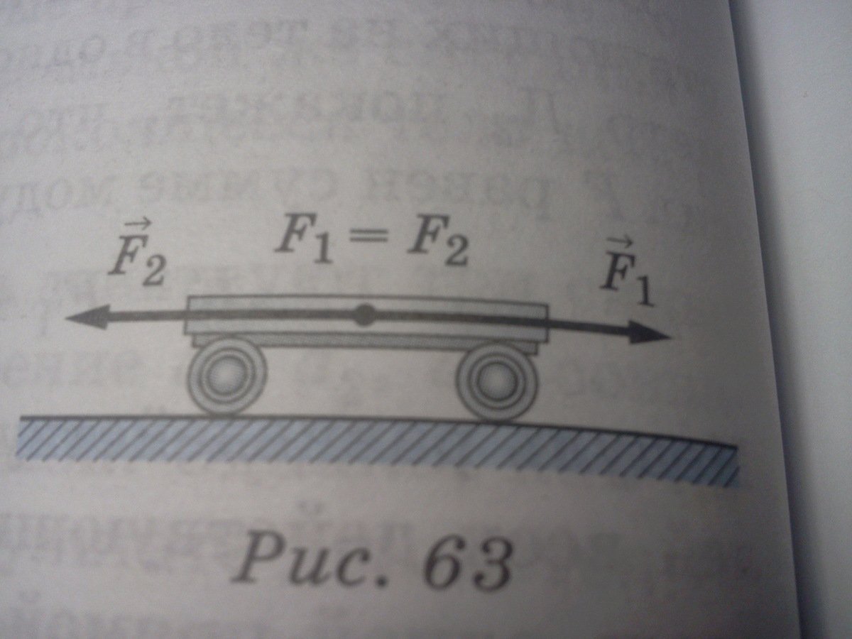 1) Чему равна равнодействующая сил F1 и F2,действующих на тележку. Что вы можете сказать о движении тележки? Рис. 63
