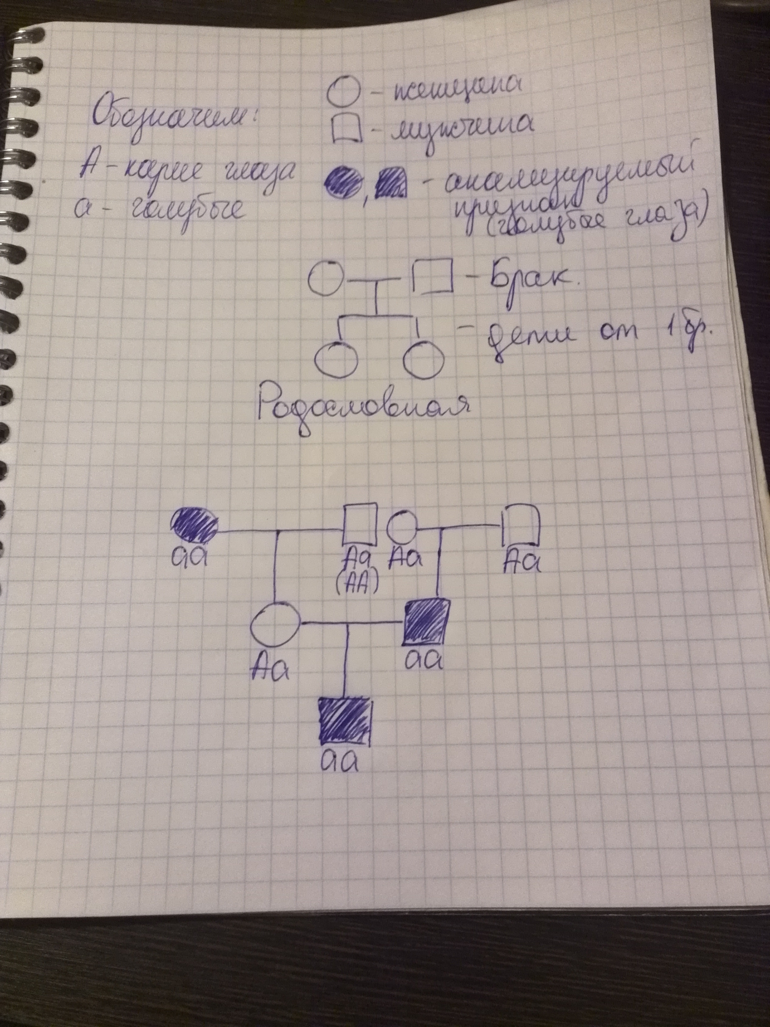 2. У человека аллель карих глаз (А) доминирует над аллелем голубых глаз (а). Ваш знакомый сообщает, что в его семье у дедушки и бабушки по отцовской линии, дедушки по материнской линии и матери карие глаза. Бабушка по материнской линии и отец – голубоглазые, так же, как и сам ваш знакомый. Определите генотипы перечисленных членов семьи и составьте родословную.