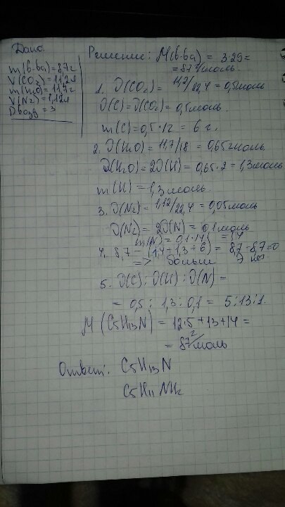 найти молекулярную формулу вещества, при сжигании 8,7 г его образовалось 11,2 л оксида углерода 4, 11,7г воды и 1,12л азота, относительная плотность по воздуху 3