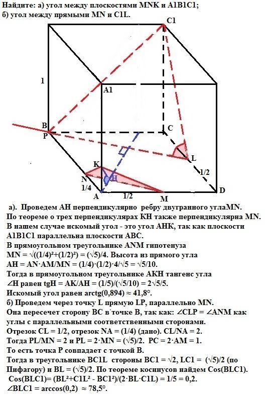 Угол (MN^C1L) = arccos(0,2) ≈ 78,5°.