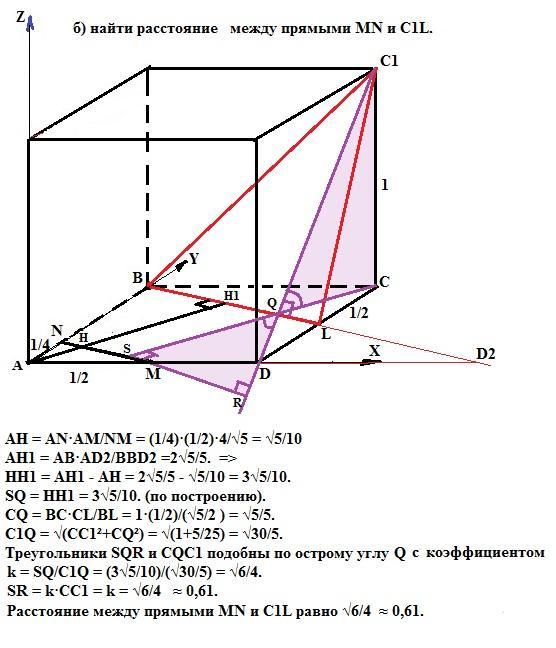 б) Расстояние между прямыми MN и С1L равно √6/4 ≈ 0,61