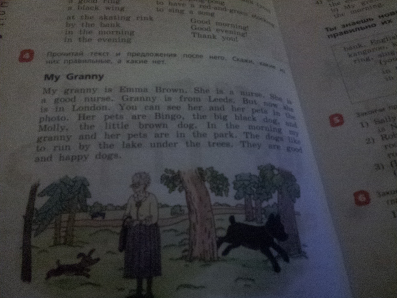 мою бабушку зовут емма браун. она работает няней. она хорошая няня. бабушка из города Лидс. но сейчас она в лондоне. ты можешь её видеть и её питомцев на фотографии. её питомцы это бинго черная большая собака и моли коричневая маленькая. утром моя бабушка и её собкаи в парке. собаки любят бегать к озеру под деревьями. они хорошие и счастливые собаки
