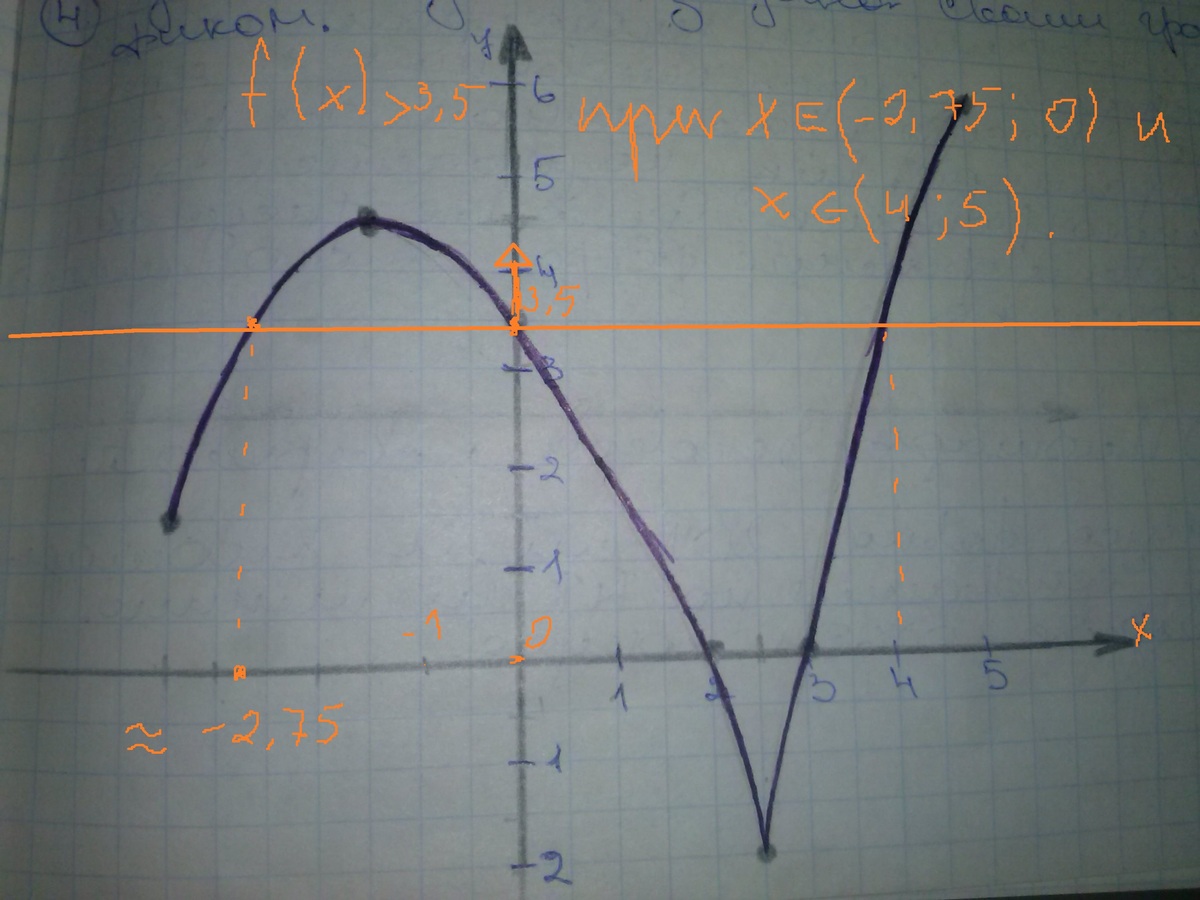 2) Откладываем точку на оси ординат (вертикальная ось), равную 3,5. Дальше проводим через нее прямую, параллельную другой оси. Смотрим, на каких промежутках график находится выше построенной прямой. Он будет выше на промежутках (-2,75 ; 0) и (4 ; 5). Скобки круглые, потому что знак неравенства строгий (крайние точки не включаются в ответ, т.к. в них функция как раз равна 3,5. А нам нужно больше).