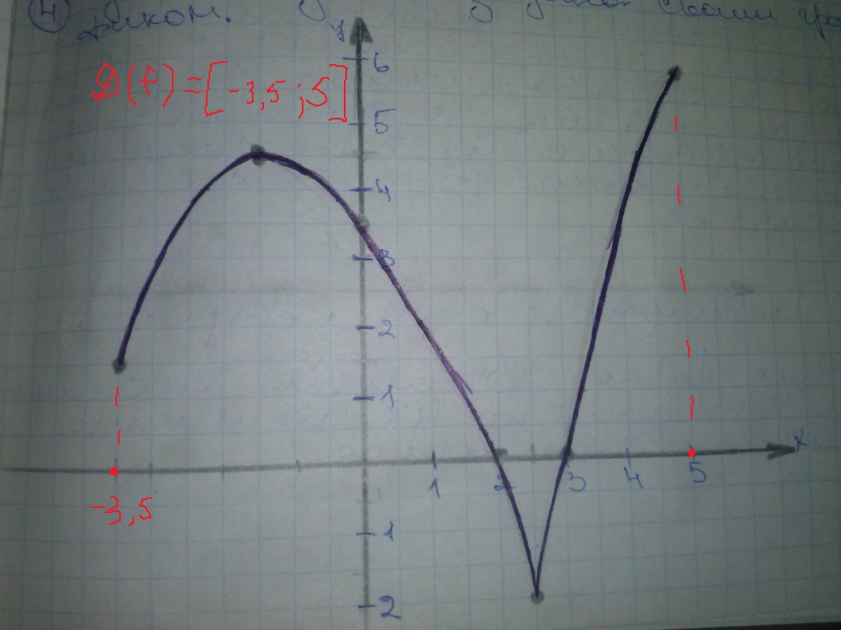 1) Область определения - промежутки, на которых у функции есть значение. В нашем случае нам нужно выбрать промежутки на оси абсцисс (горизонтальной оси), потому что именно они задают всевозможные значения аргумента х. Для данной функции область определения будет записана таким промежутком: [-3,5 ; 5]. Квадратные скобки потому, что крайние точки включены в область определения (то есть, значение функции в этих точках определено).