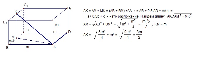 Точка К - середина ребра В1С1 куба АВСDА1В1С1D1. Разложите вектор AK по векторам a=AB, b=AD, c=AA1 и найдите длину этого вектора, если ребро куба равно m.