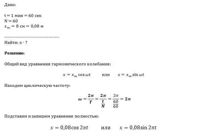 напишите уравнение гармонических колебаний если за 1 мин совершается 60 колебаний амплитуда 8 см
