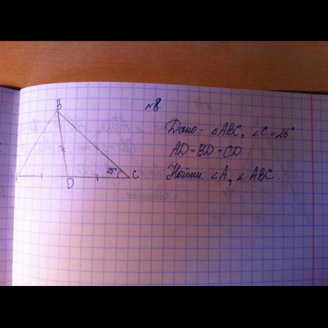 Треугольник DBC ровнобедренный ( DB=DC), значит угол DBC= углу DCB=25 градусов (углы при основе). Угол BDC=180-50*2=80 градусов (сумма углов треугольника 180 градусов)