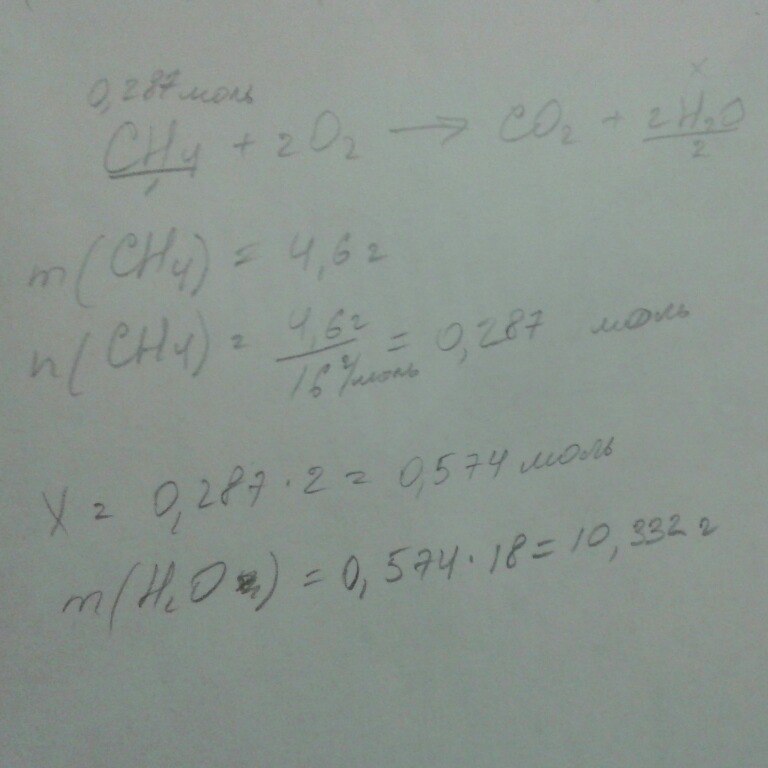 Какая масса воды (H2O) образуется при сжигании в кислороде (О2) 4,6 г метана (CH4)? Уравнение реакции: CH4 + 2O2 → CO2 + 2H2O