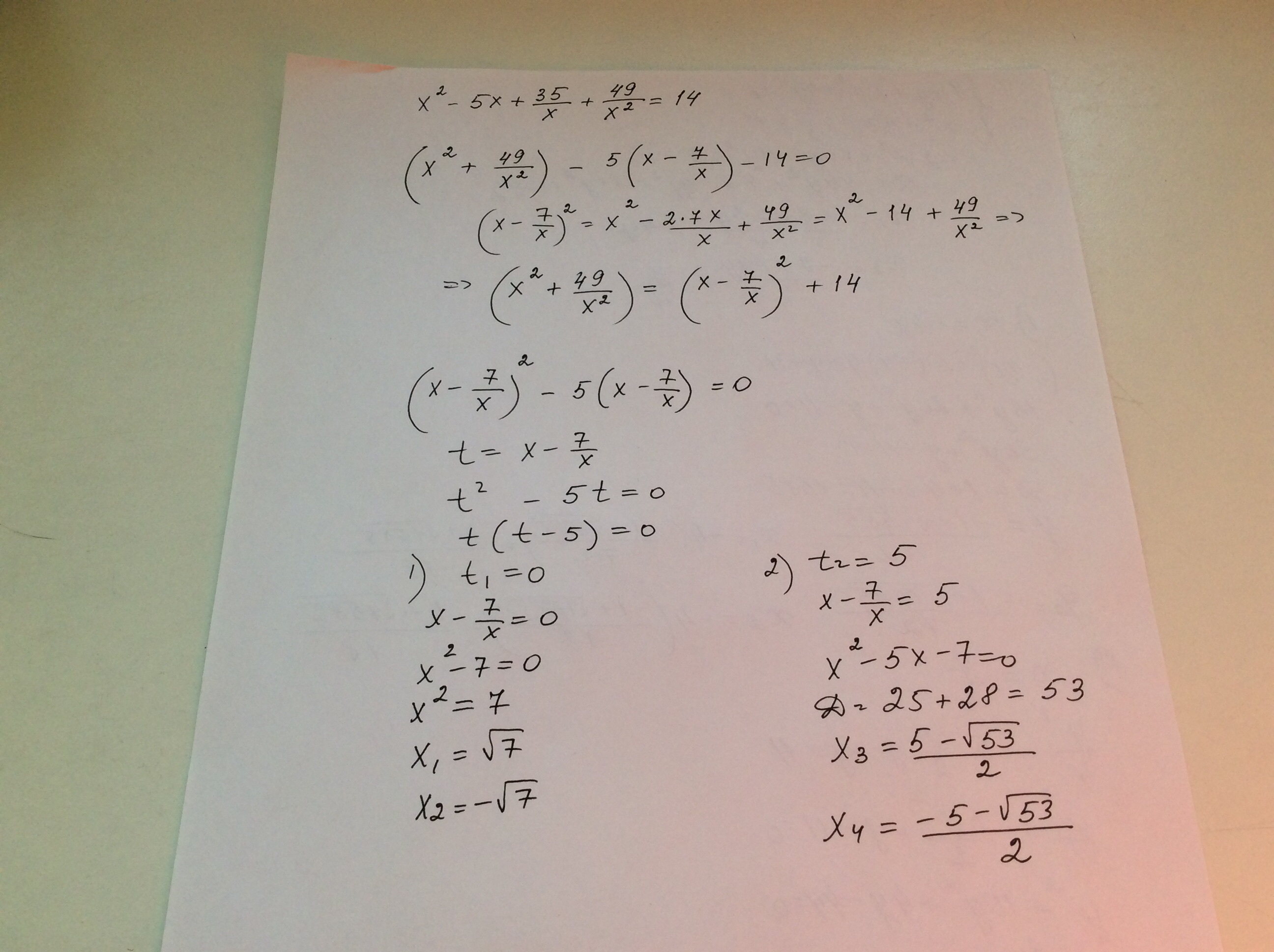 Решите через t пожалуйста  x^{2} -5x+ frac{35}{x} + frac{49}{ x^{2} } =14