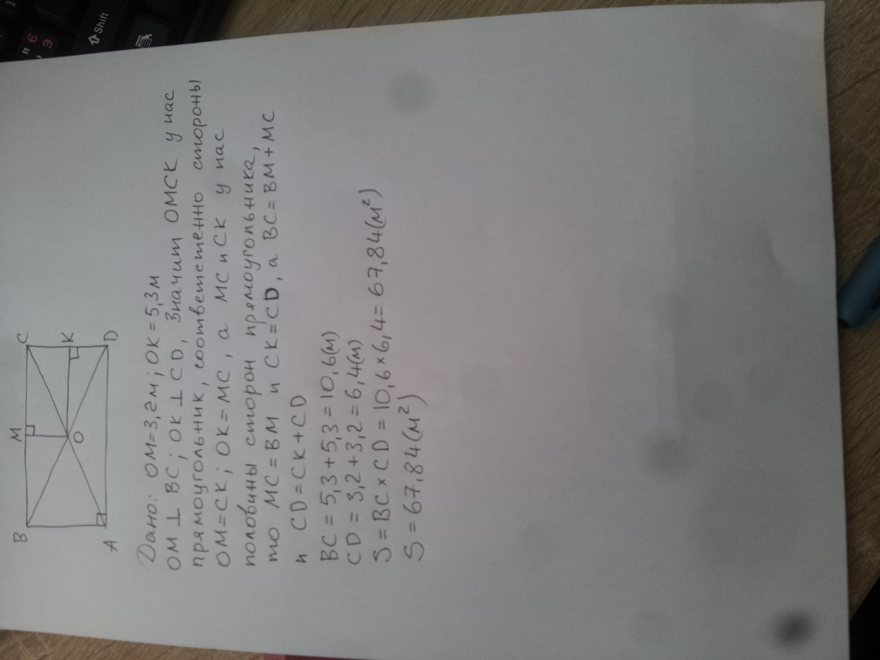 От точки пересечения диагоналей прямоугольника до сторон 3,2м., и 5,3м. Найти площадь прямоугольника.