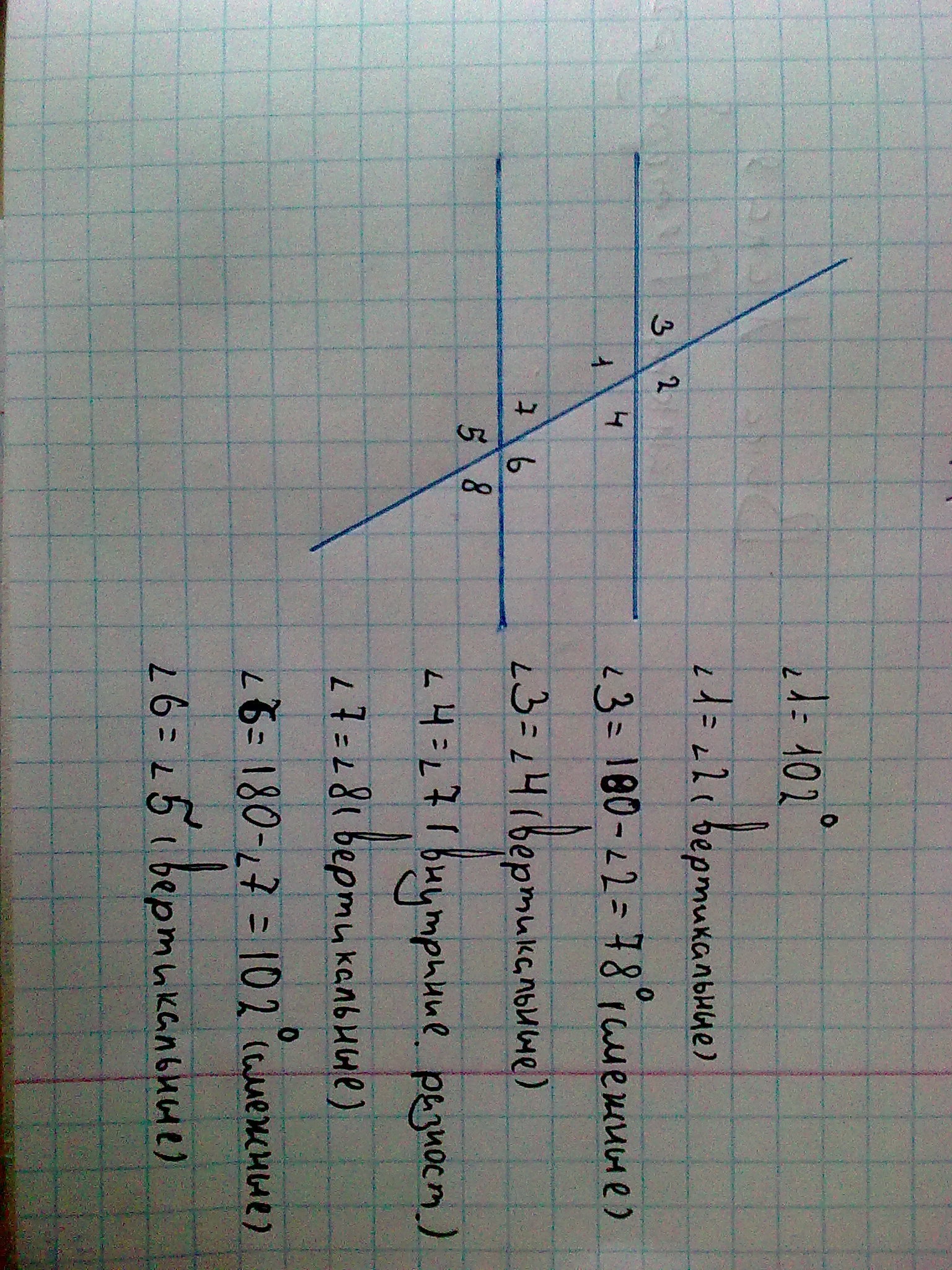 знайдіть усі кути утворені при перетині двох паралельніх прямих січною якщо один з цих кутів дорівнює 102 градуса