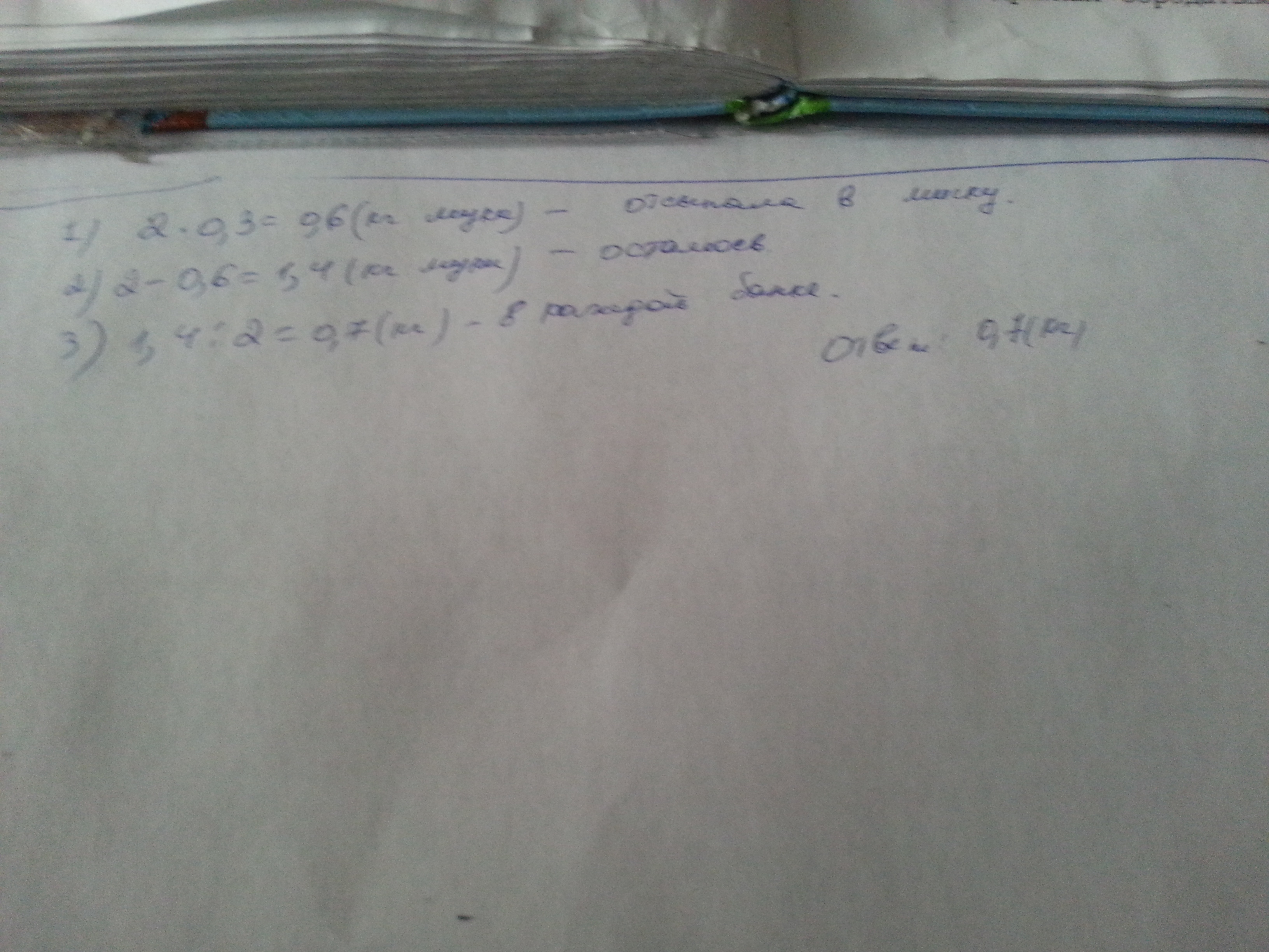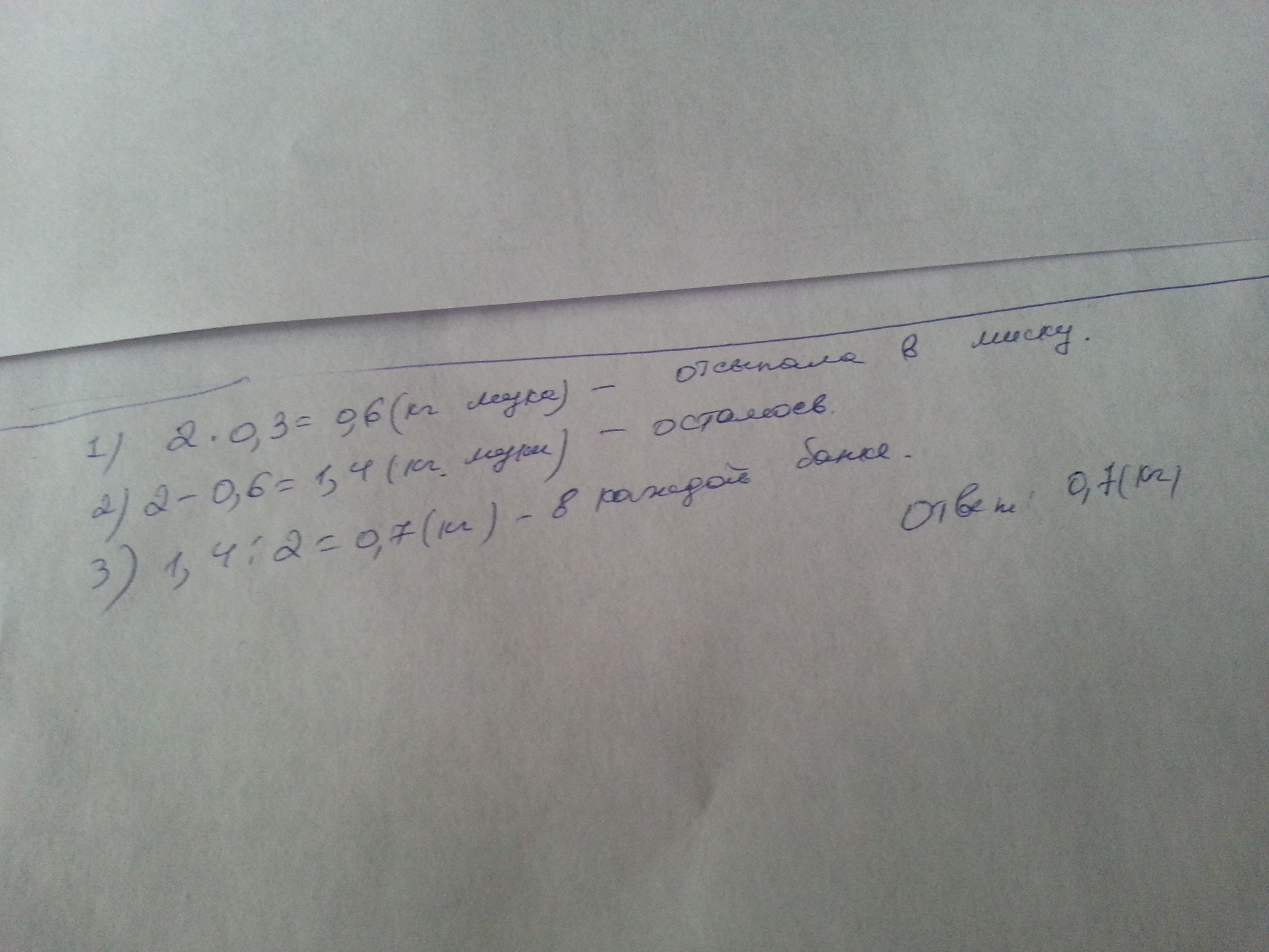 В пакете 2кг муки. Для теста хозяйка отсыпала в миску 0,3 этой муки, а оставшуюся муку рассыпала поровну в две банки. Сколько муки в каждой банке? СРОЧНО!