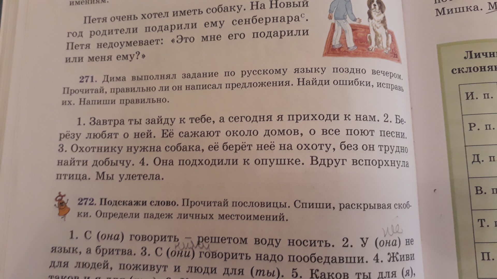 1 Завтра я зайду к тебе, а сегодня ты приходи к нам. 2 Берёзу все любят. Её сажают около домов, о ней поют песни. 3 Охотнику нужна собака, он берёт её на охоту, она без труда найдёт добычу. 4 Они подходили к опушке. Вдруг вспорхнула птица. Она улетела.