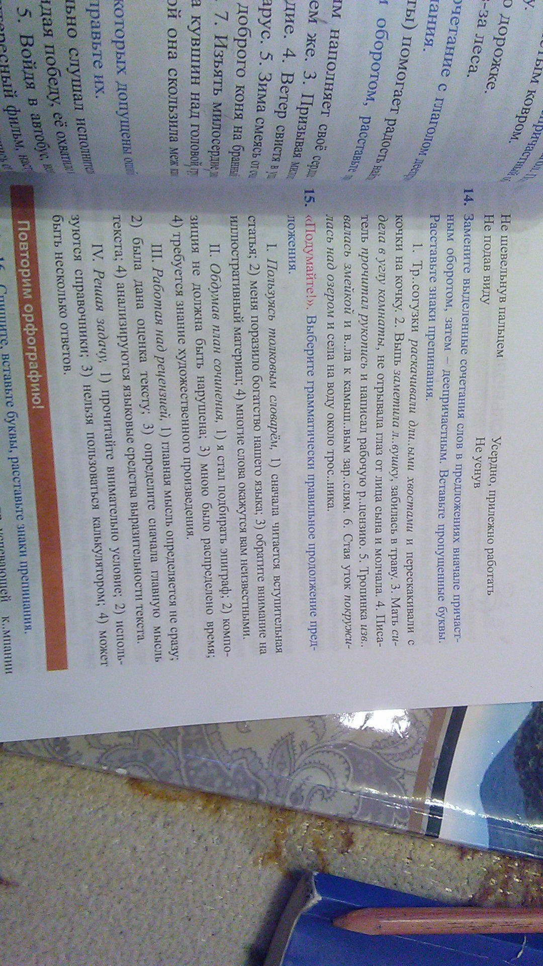1.трясогузки, раскачивая длинными хвостами, перескакивали с кочки на кочку.2. Выпь, заметив ловушку, забилась в траву.3. Мать,сидя в углу комнаты, не отрывала глаз от лица сына и молчала.4. Писатель, прочитав рукопись, написал рецензию,5. Тропинка, извиваясь змейкой , вела к камышовым зарослям. 6. Стая уток, покружившись над озером, села на воду около тростника.