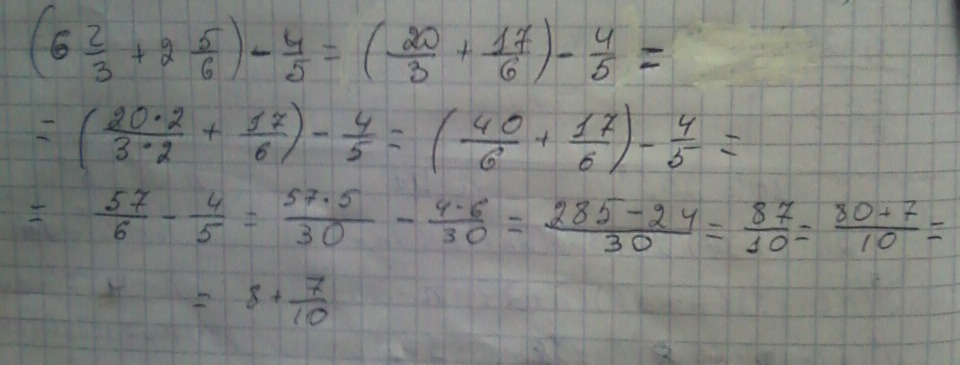 (6целых 2/3 + 2целых 5/6) - 4/5=(20/3+17/6)-4/5=97/6-4/5=9целых 1/2 - 4/5=8целых 7/10