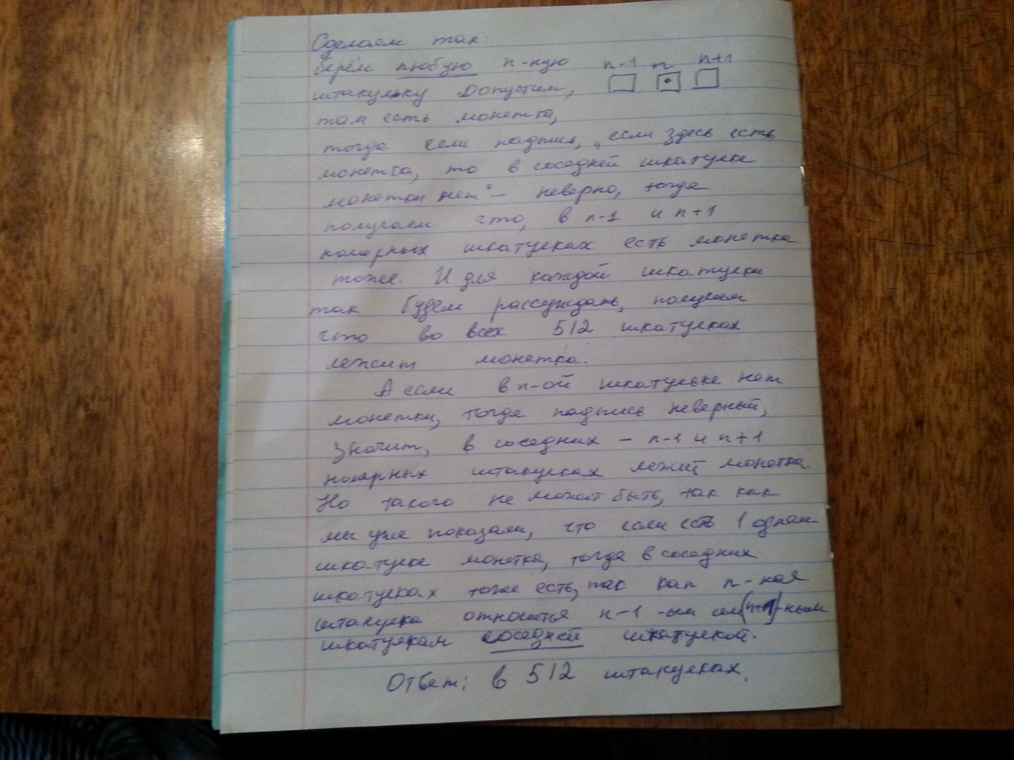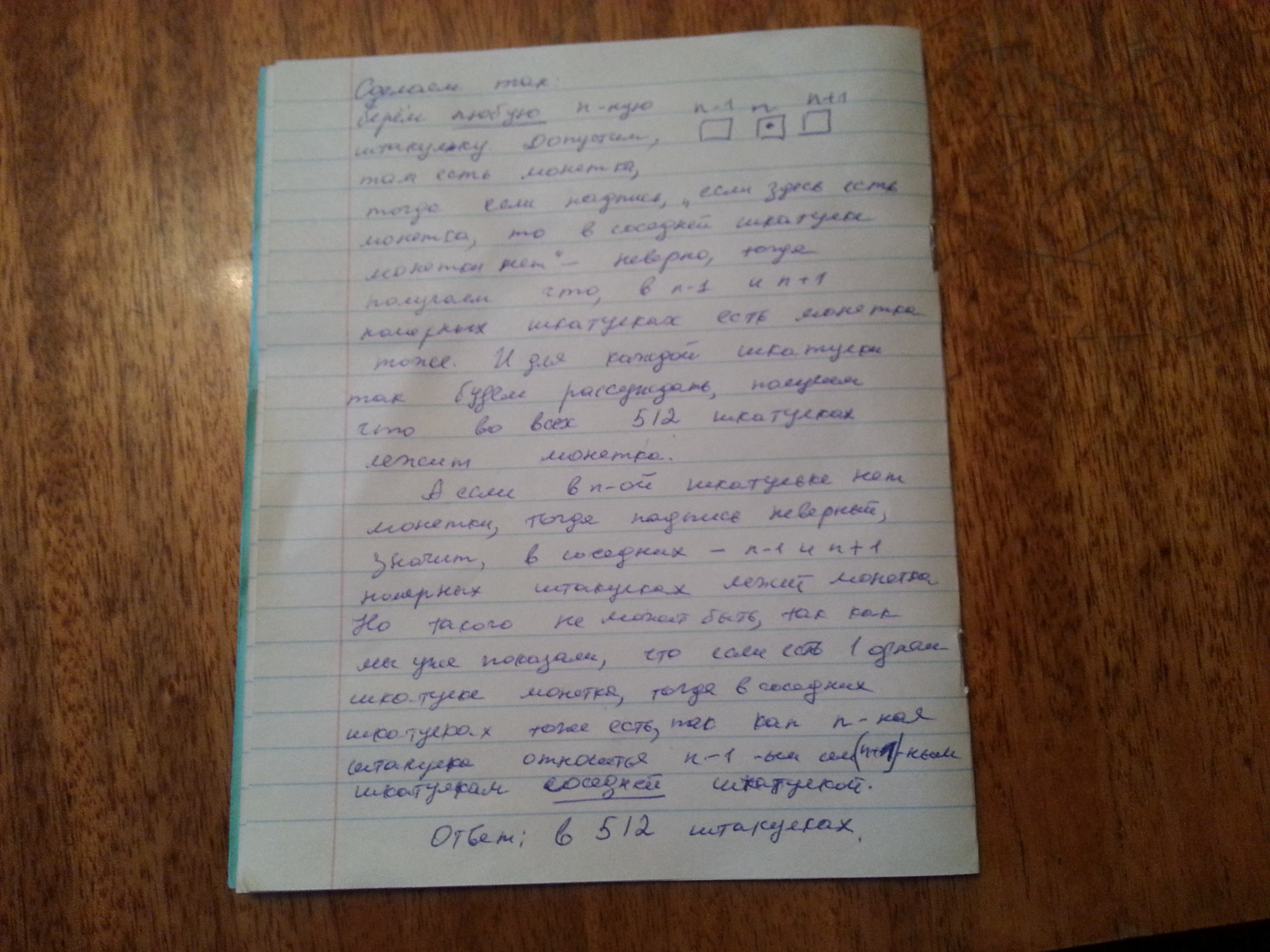 По кругу стоят 512 шкатулок. В каждой шкатулке либо лежит монетка, либо не лежит. На каждой шкатулке имеется надпись: <<Если здесь лежит монетка, то в соседней шкатулке монетки нет>>. Известно, что все надписи не соответствуют действительности. В скольких шкатулках лежит монетка?