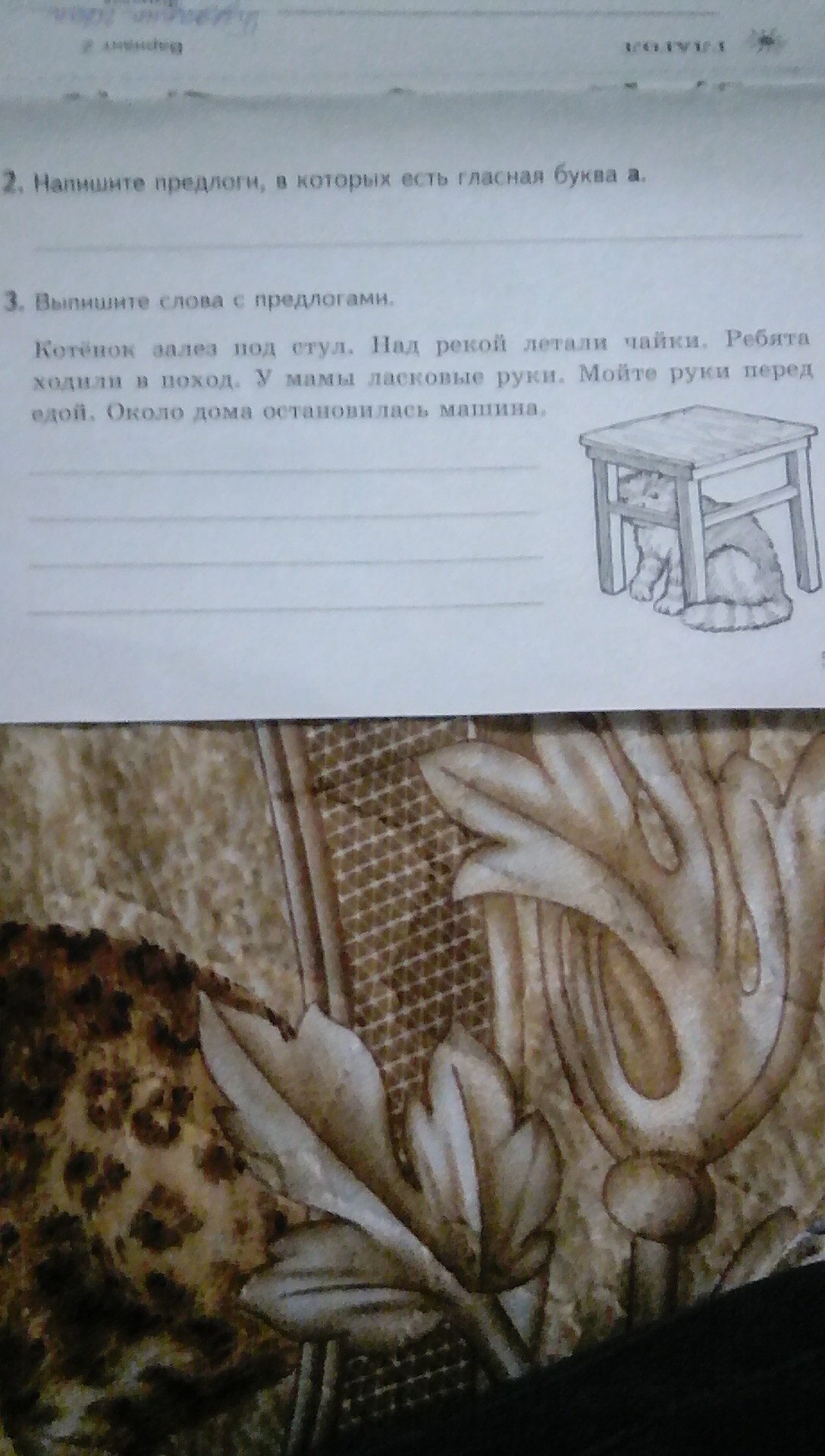3) под стул, над рекой, в поход, перед едой, около дома.